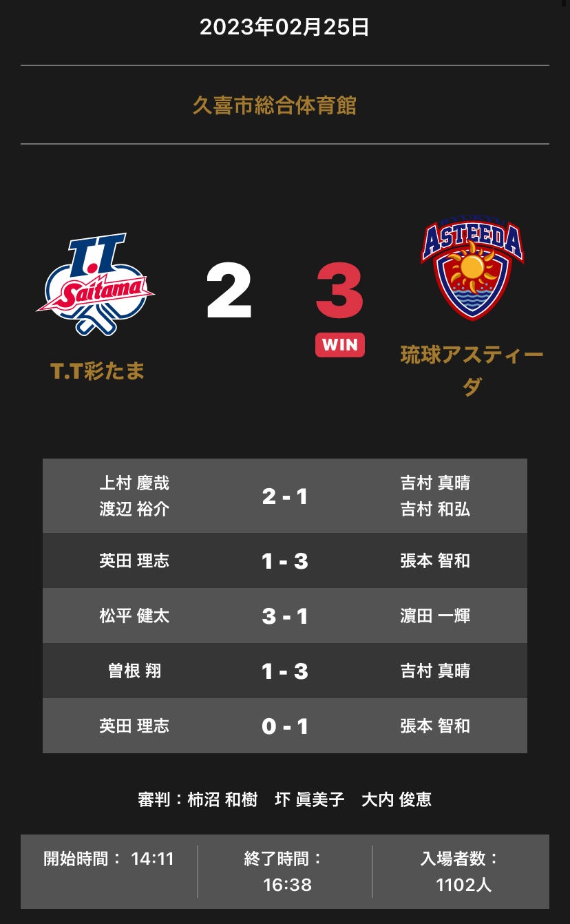 の試合結果は2‐3で琉球アスティーダが勝利しました。