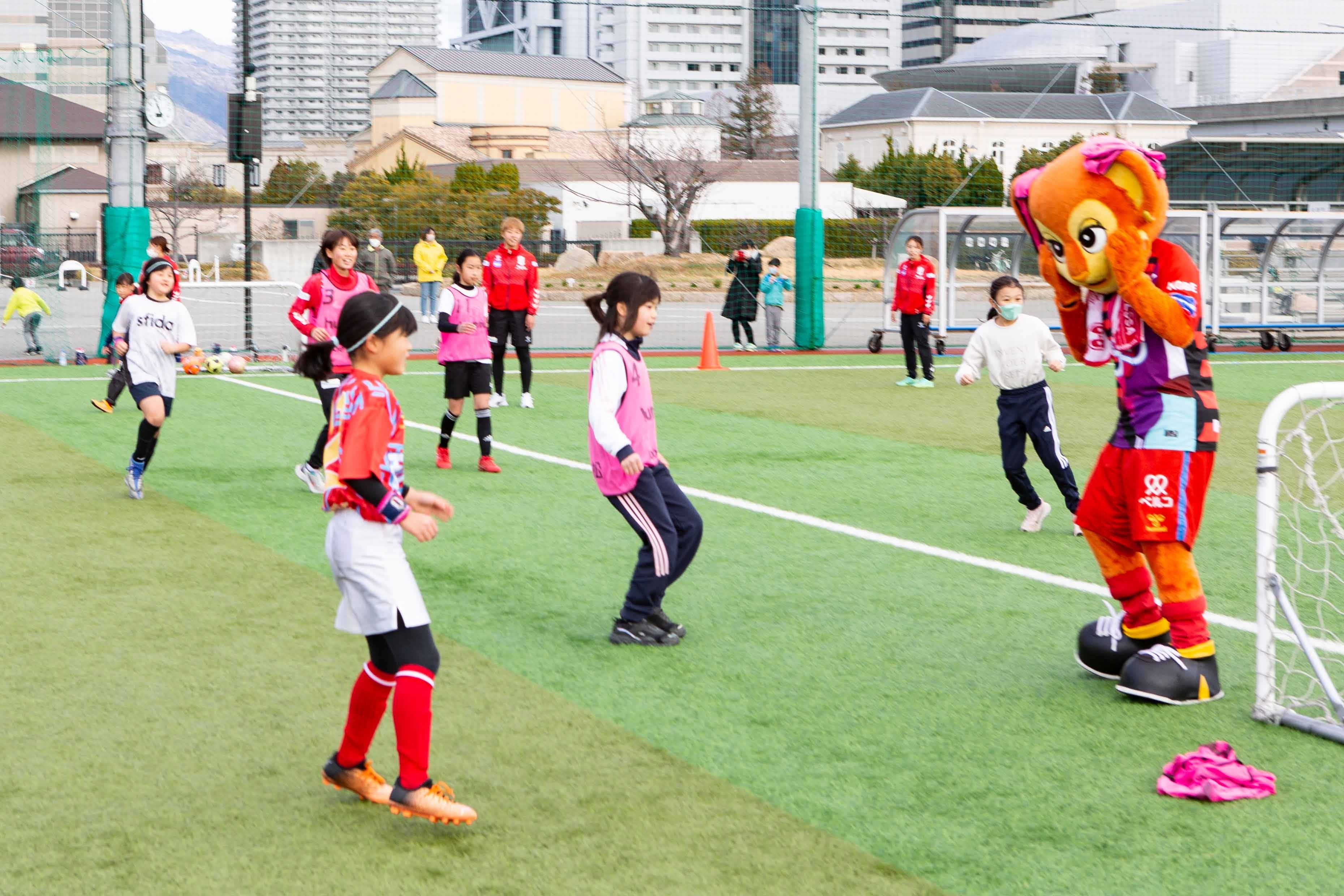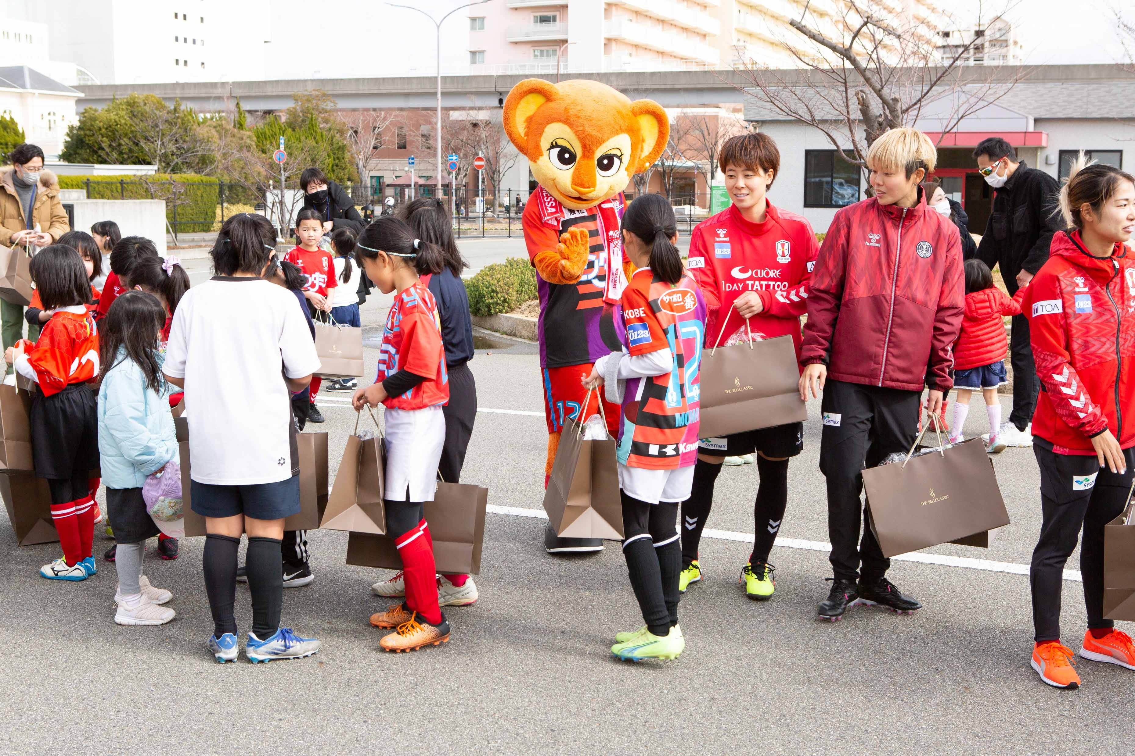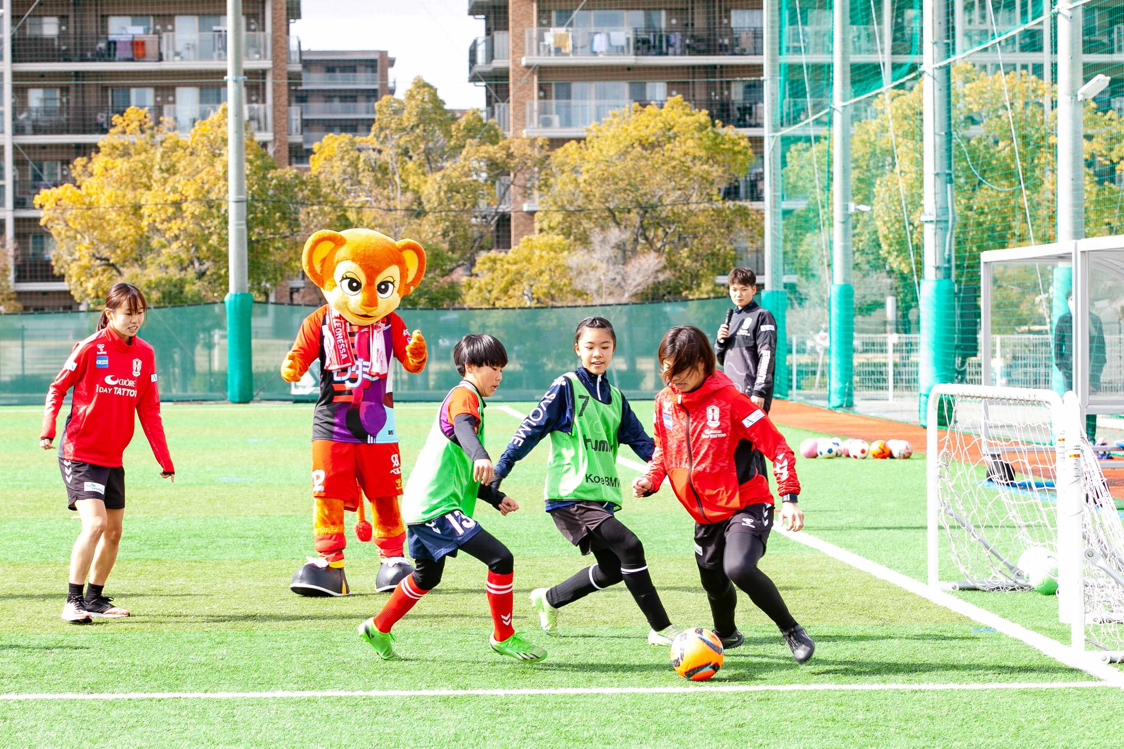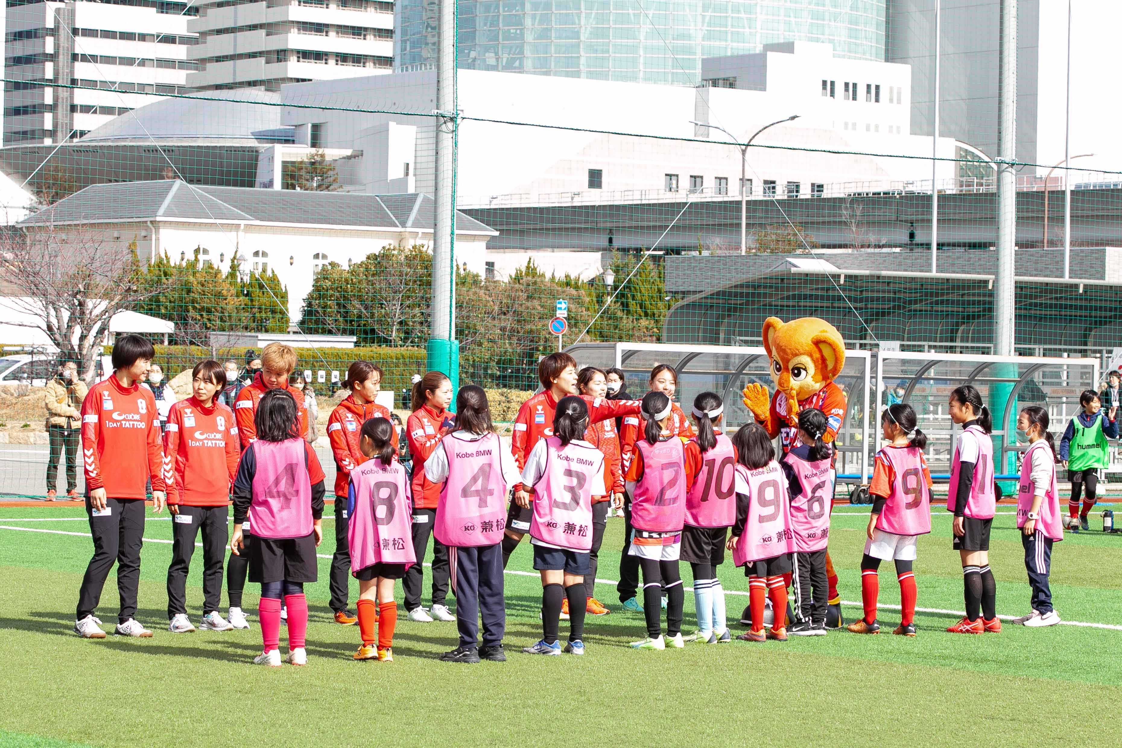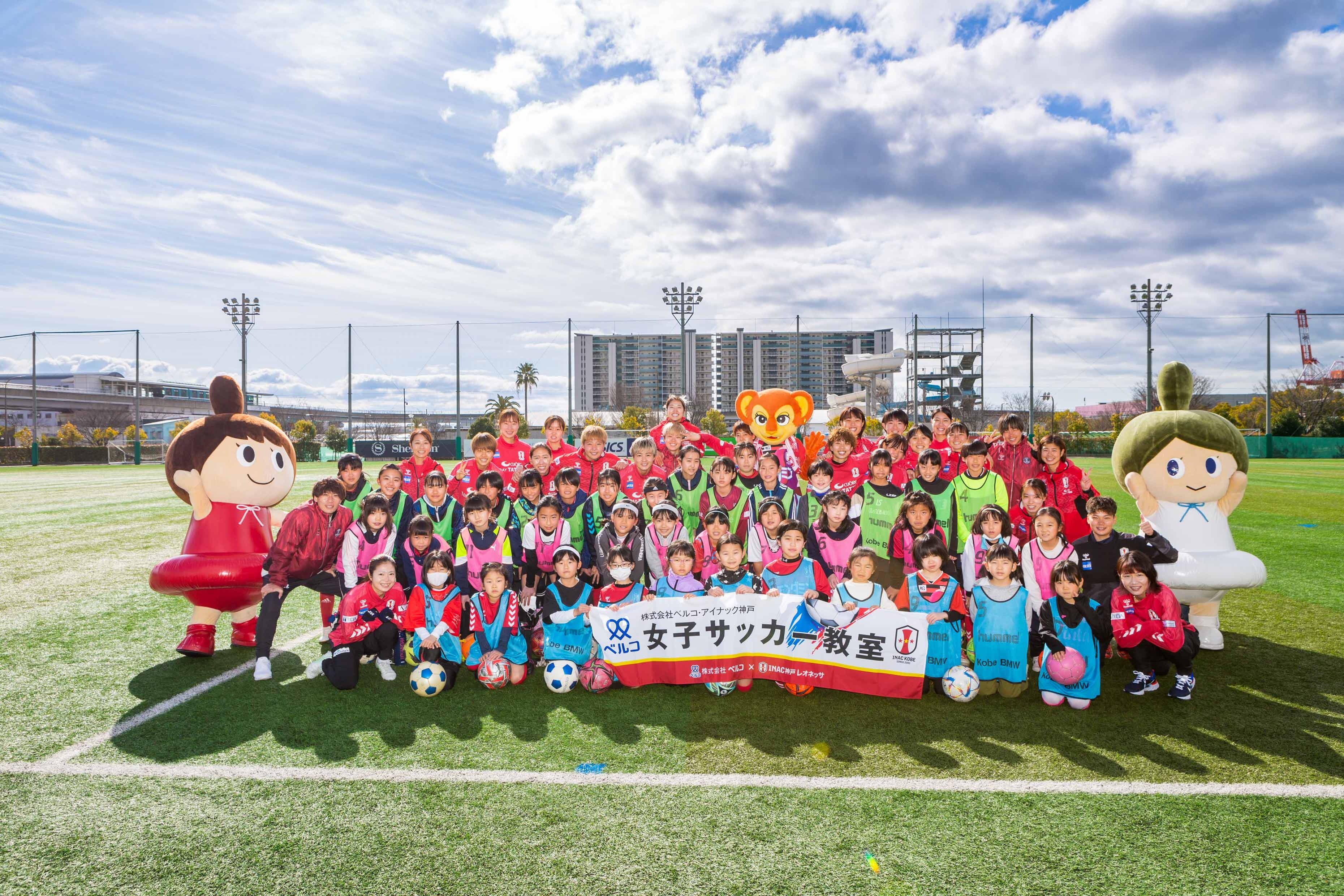 冠婚葬祭を主として事業を行う「株式会社ベルコ」がINAC神戸レオネッサと協力し、2月11日に神戸市東灘区の神戸レディースフットボールセンターでサッカー教室を開催致しました。小学1年生から6年生までの女子児童を対象に、INAC神戸の現役選手25名が指導にあたり、学年ごとの数グループに分かれて基礎的な練習から参加者のレベルに応じた練習を行いました。