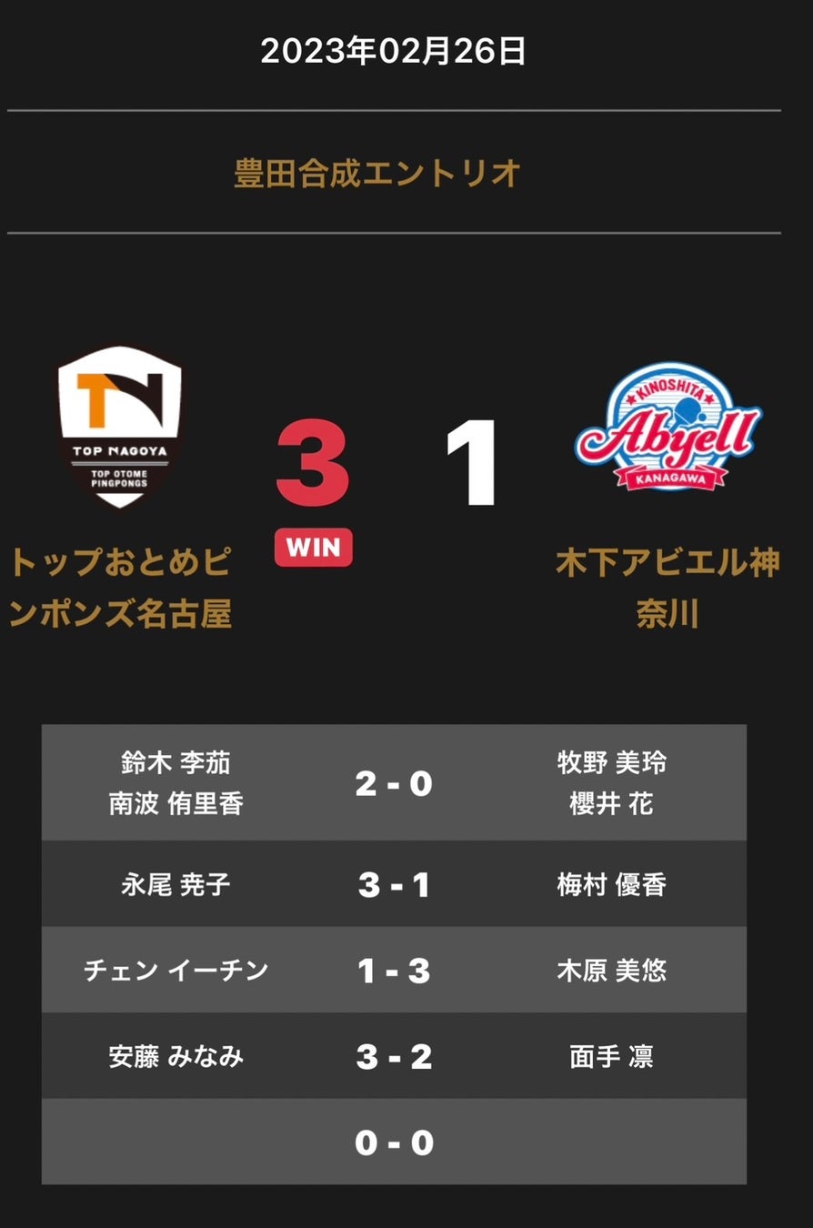 トップおとめピンポンズ名古屋と木下アビエル神奈川の試合は3-1でトップおとめピンポンズ名古屋が勝利しました。