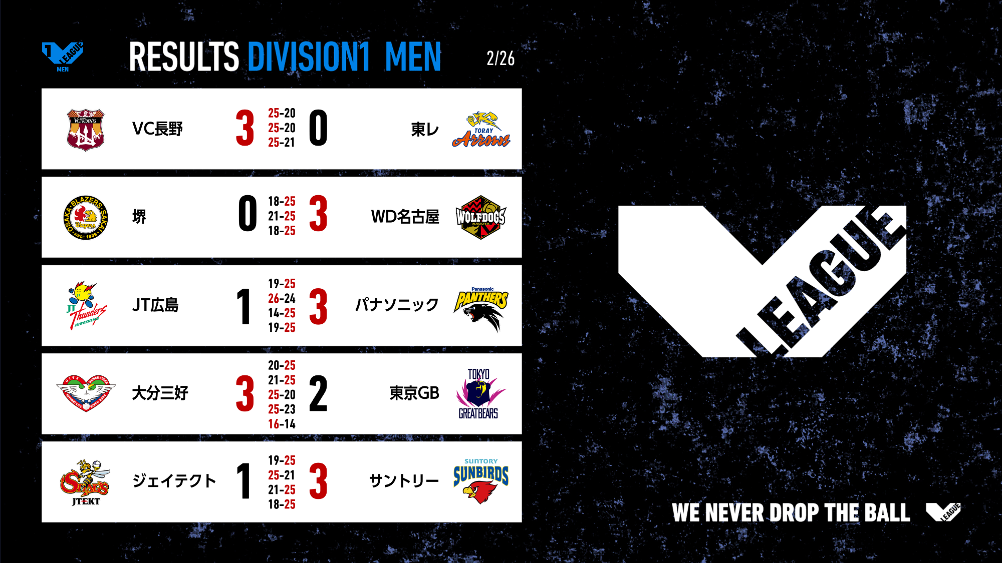 バレーボール国内最高峰リーグ V.LEAGUE【2月26日の試合結果】