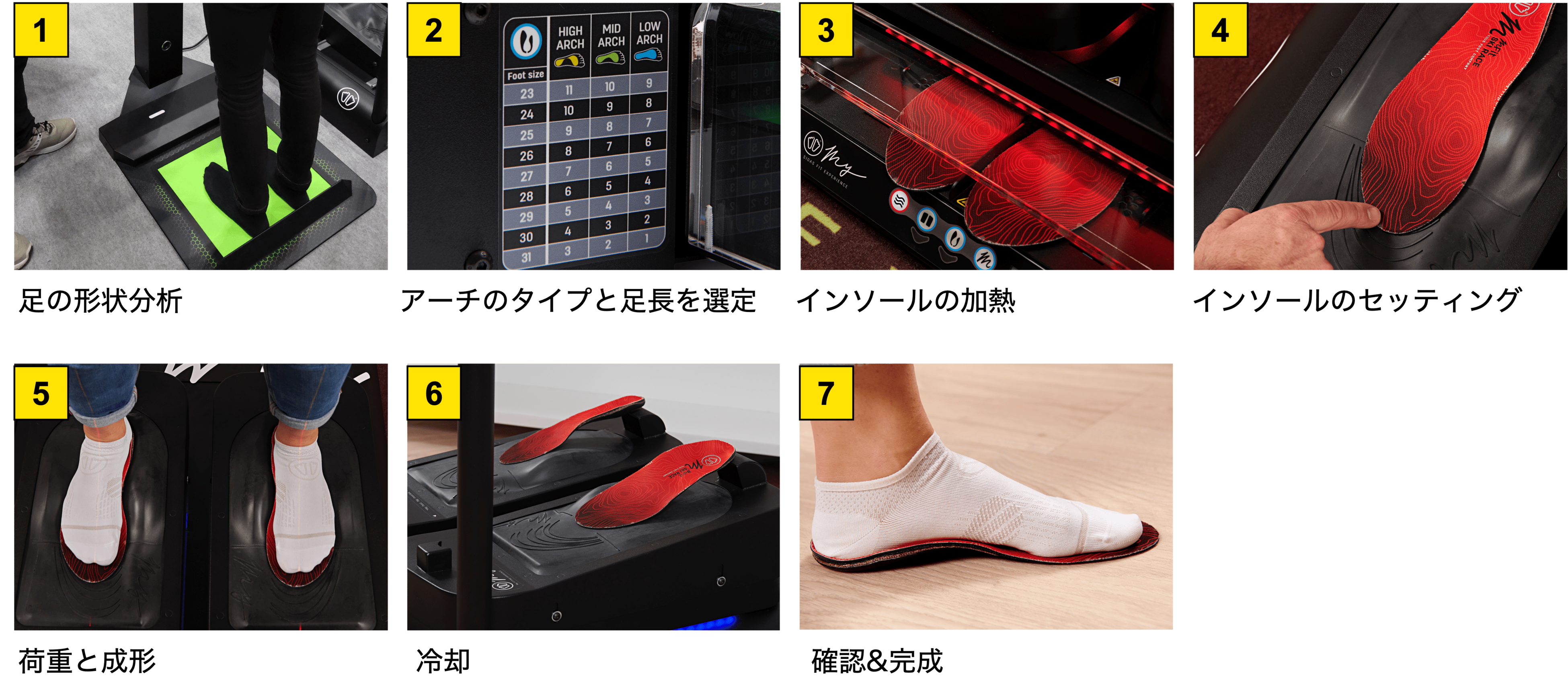 このたび、フランス本社で新たに開発されたカスタムインソール専用機器「MY FIT STATION」では、蓄積されたシダスの成形インソールのテクノロジーをさらに進化させ、自動でパーソナライズされた足裏形状をマシンに再現することで、誰もが短時間で簡単にカスタムインソールを作成することが可能になりました。赤外線加熱オーブン、自動調整成形パッド 、レーザーアライメント 、冷却ファンといった各種機能がコンパクトな1台に集約され、10分以内でサービスを提供します。