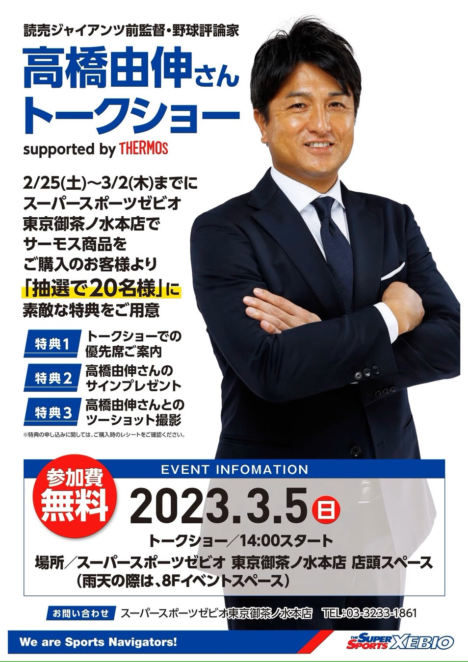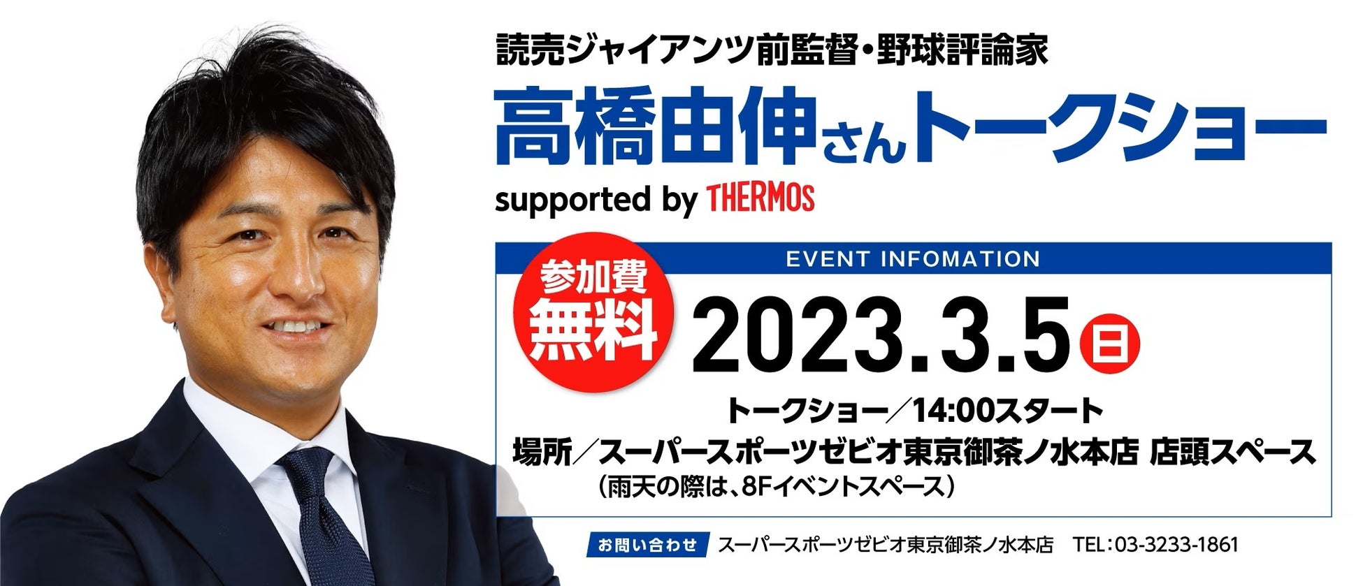 株式会社ヴィクトリア(ゼビオグループ・本社:東京都千代田区神田小川町)は、3月5日(日)「スーパースポーツゼビオ東京御茶ノ水本店」店頭にて、読売ジャイアンツ前監督で野球評論家「高橋由伸さん」のトークショー開催します。