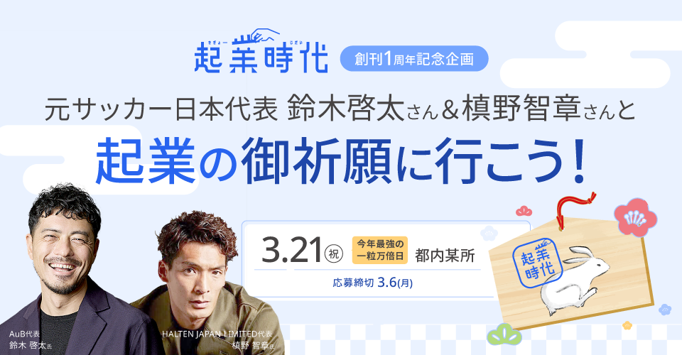 freee株式会社(本社:東京都品川区、CEO:佐々木大輔、以下「freee」)は、起業・開業の専門誌「起業時代」にて、イベント『鈴木啓太さん&槙野智章さんと起業の御祈願に行こう!』を実施します。2023年に起業する方、若しくは1年以内に起業した方を対象に本イベントに参加したい方を募集します。元サッカー日本代表で現在は会社を経営する鈴木啓太氏、槙野智章氏と共に事業成功への願いをこめて御祈願に行けるチャンスです。起業時代のアプリ内から簡単にご応募いただけますので、ぜひこの機会にご応募ください。