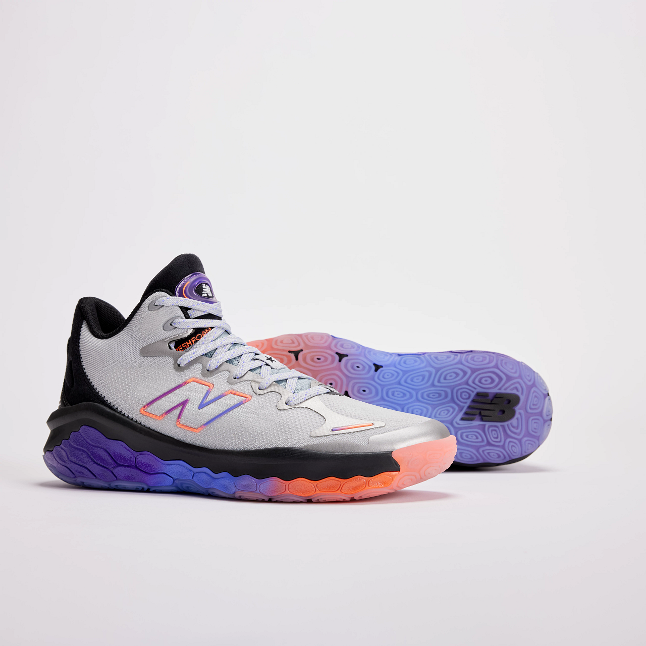 ポジションレスな今日のゲームの中で、第4クォーターでもフレッシュなパフォーマンスを発揮するためのクッション性と安定性を高次元で提供するため、ニューバランスで最も優れたクッション性を誇るFresh Foam Xをミッドソール全面に採用。快適な高い走りを実現するとともに、シューズ横のTPUケージがコート上での鋭い切り替えしを可能にする安定性をプラスします。シームレスで軽量なワンピースタイプのFitWeaveアッパーは、360度のサポート力と快適性を提供します。