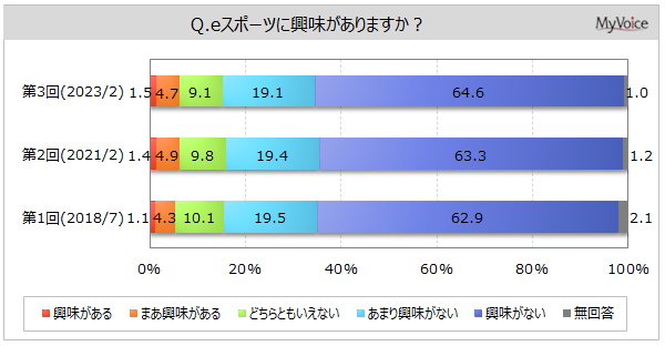 | <今 回>(2023/2)https://myel.myvoice.jp/products/detail.php?product_id=29511 ※上記設問の他に「ゲームをする頻度」「eスポーツ協賛・スポンサー企業に対するイメージ」も聞いています。 <第2回>(2021/2)https://myel.myvoice.jp/products/detail.php?product_id=27109 <第1回>(2018/7)https://myel.myvoice.jp/products/detail.php?product_id=24009 |
