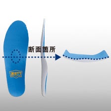 長時間使用しても足が疲れにくい立体構造で、足裏の3つのアーチをしっかり支えて足の指まで力が入ります。