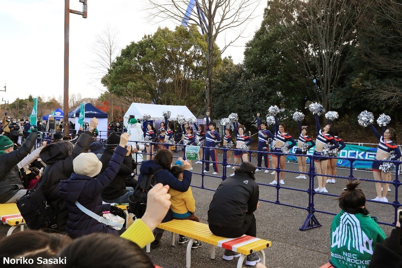 試合前場外パフォーマンスエリアおよび、オープニングとハーフタイムにはNECロケッツチアリーダーSPARKLESが登場!