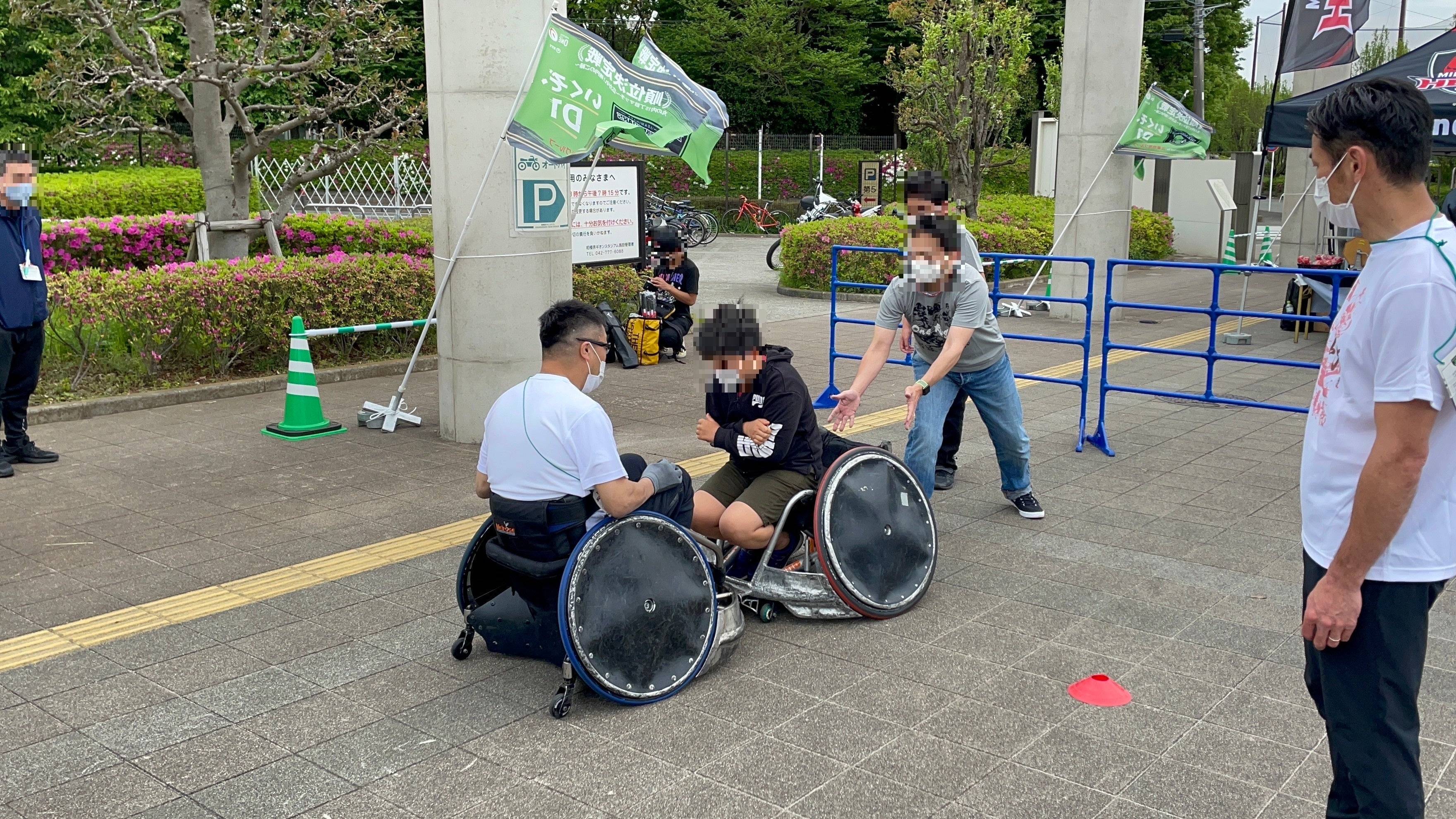 車いすラグビー体験会の様子。試合で使用されている車いすラグビー専用の車いす通称“ラグ車”に乗って頂けます。