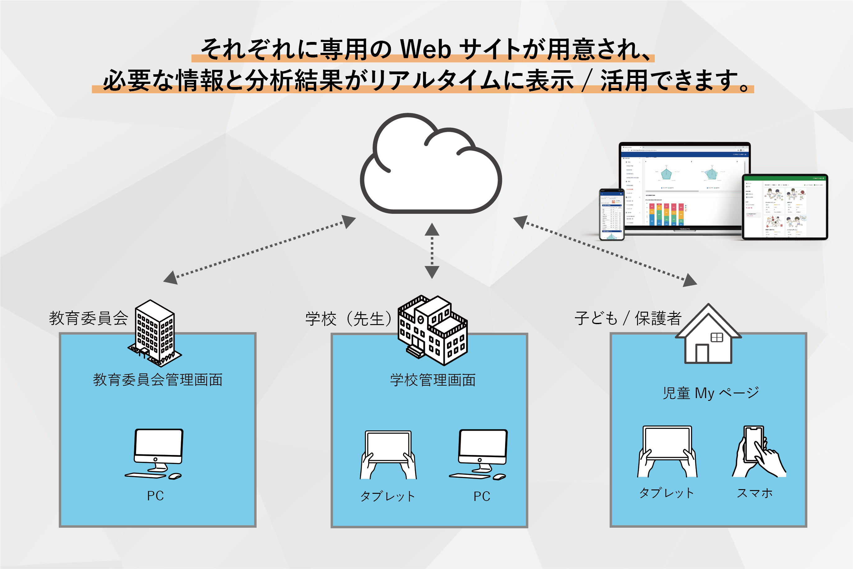 「めっちゃMORIMORIスポーツテストシステム」は、児童それぞれに合った学習の実現や、教員、学校、教育委員会がそれぞれの課題に即した教育の充実を図ることを支援するために開発をした学習支援システムです。