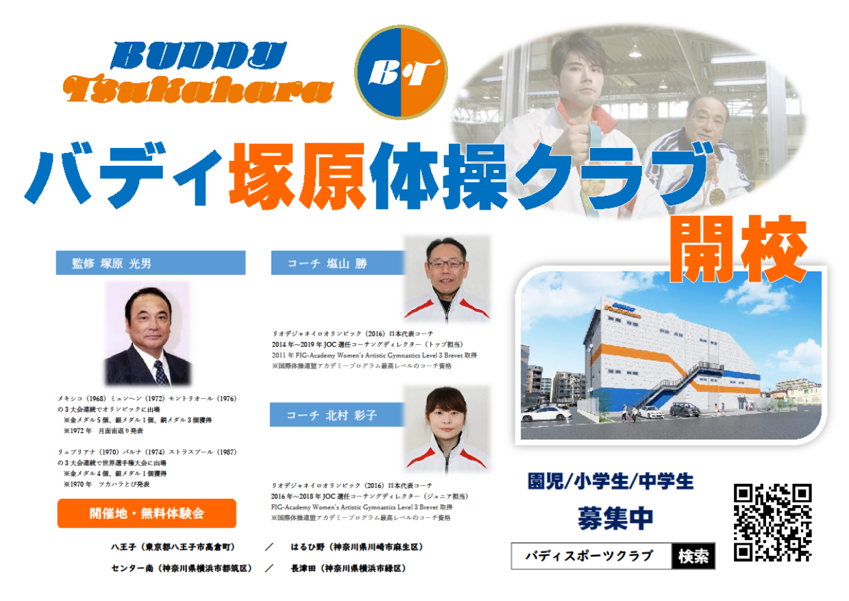 オリンピック3大会に出場し2大会連続で金メダルを獲得した月面宙返りの生みの親・塚原光男氏が運営する「塚原体操センター」は、これまでに25名のオリンピアンを輩出した名門クラブ。2023年4月より新たに開校するバディ塚原体操クラブでは、これまで多くのオリンピック選⼿を育成し排出し50年に及ぶ指導経歴と優れたカリキュラムでアスリートの発掘、育成を行います。また、クラブ発足に伴い、東京都八王子市に『バディ塚原体操センター』を設立します。(2023年度 完成予定)