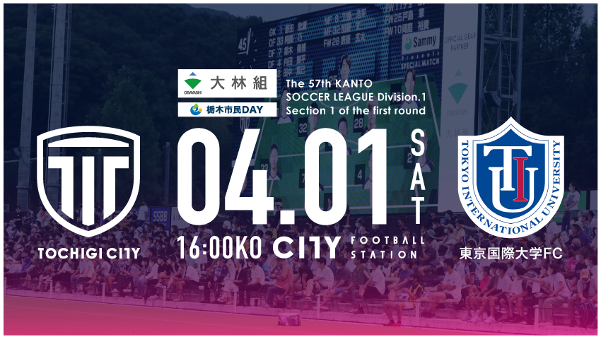 2023年4月1日(土)に開催するホーム開幕戦、第57回関東サッカーリーグ1部前期1節vs東京国際大学FC(16:00キックオフ@CITY FOOTBALL STATION)は、ホームタウンである「栃木市民デー」として開催することが決定いたしましたので、お知らせいたします。