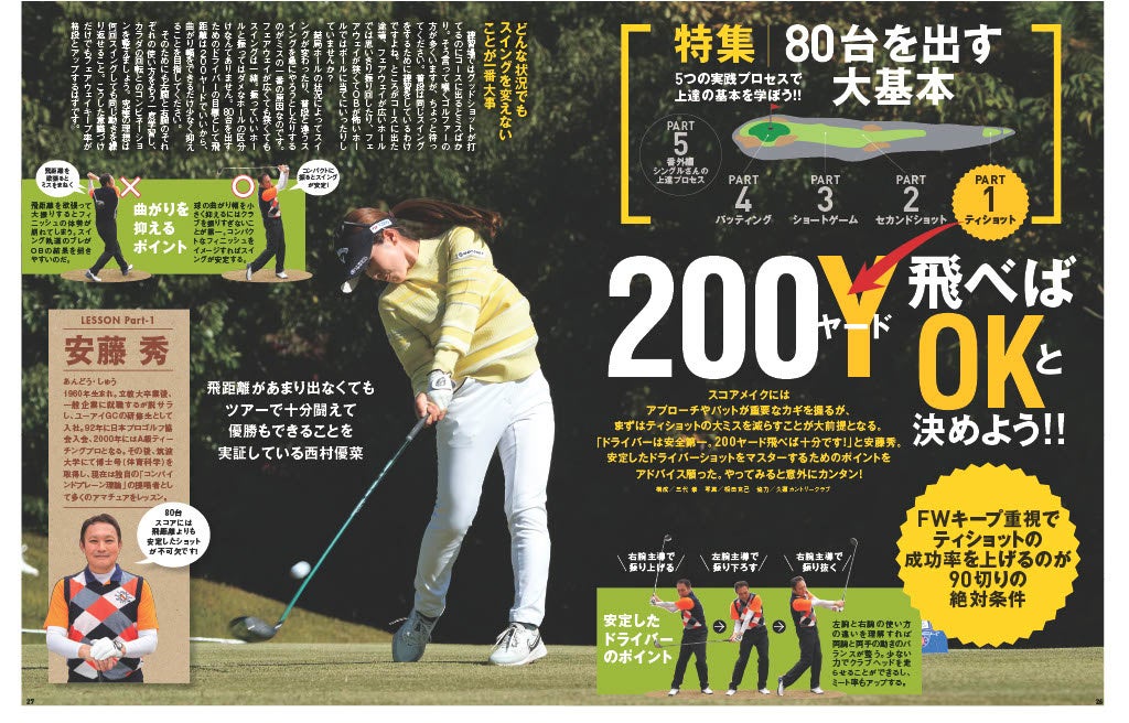 巻頭特集は雑誌のコンセプトでもある「80台で回りたい!」を受けて、本格的なシーズンインに向けて、実際のラウンドでは何をするべきかを簡潔に、そして思い切った提言を打ち出しています。ティショットでは飛ばすのではなくて、200ヤードで距離は充分で、確実にフェアウェイキープを目指そうとか、アイアンではダフリ、トップの防ぎ方、アプローチではパターの転がしからイメージするとか、ファーストパットは入れに行かない!という思い切ったタイトルで展開。最後に実際に80台を出せた時の体験談も掲載します。