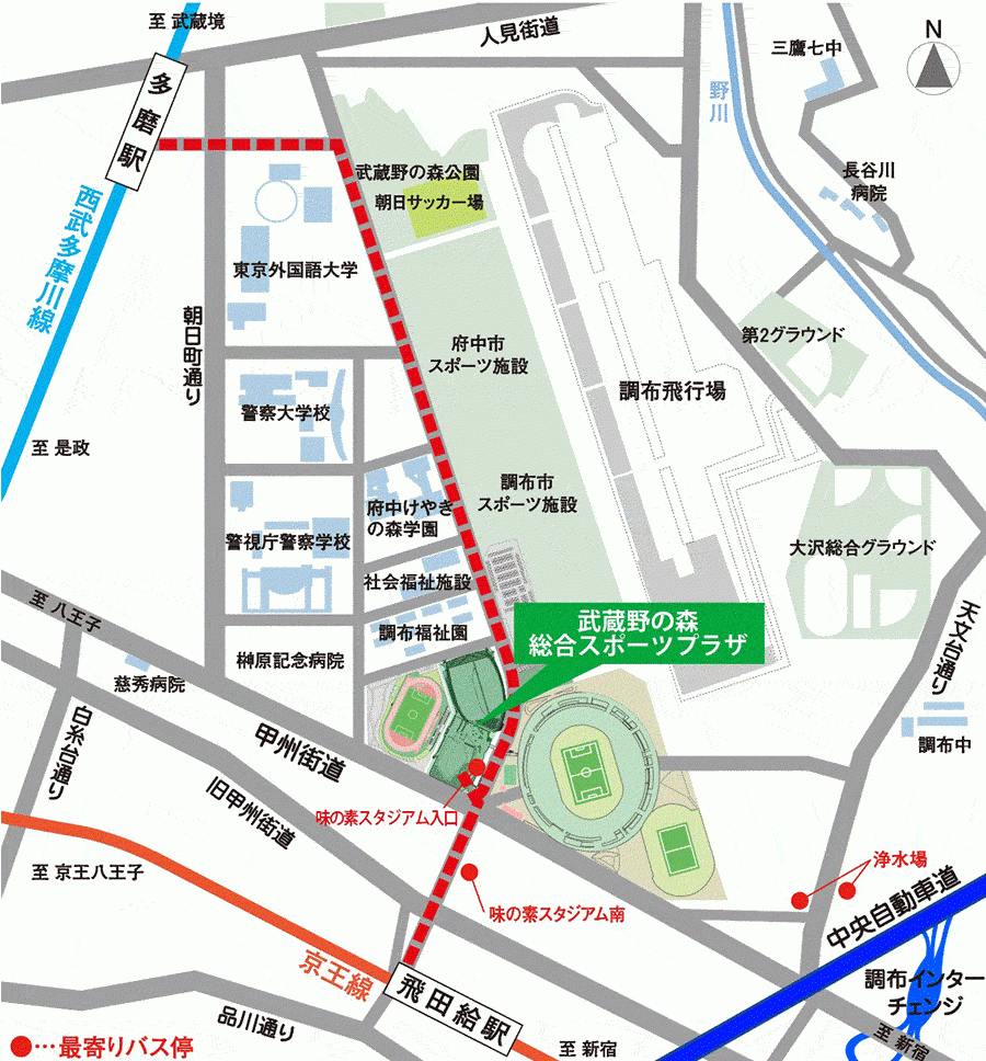 京王線:飛田給駅より徒歩5分、西武多摩川線:多磨駅より徒歩20分