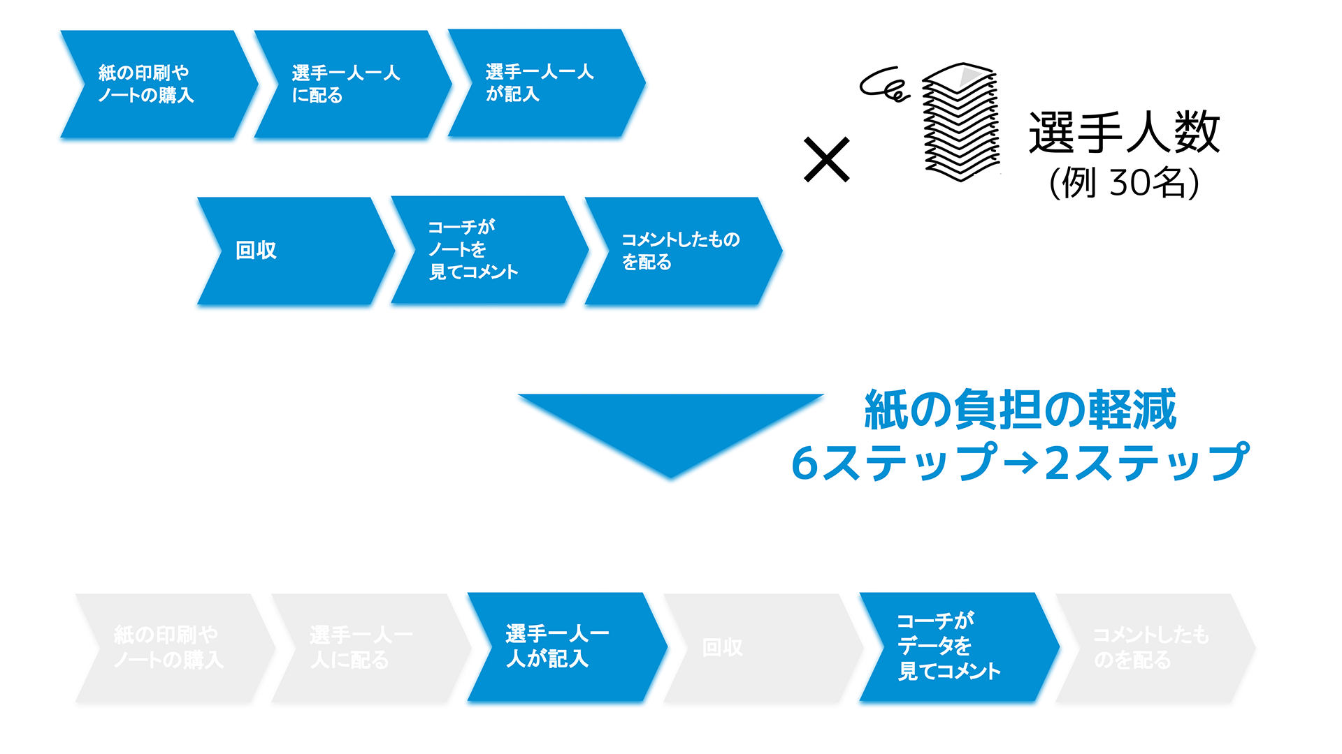 紙の練習ノートを使った選手の育成方法は、手間が多く、特に選手数の多いチームでの運用は現実的に困難です。BuildではITの強みを活かした仕組みにより6ステップある負担を2ステップに削減することができます。