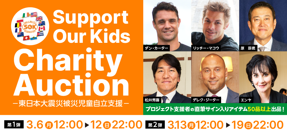 | 寄付先 | オークションの売り上げは、東日本大震災被災児童自立支援プロジェクト「Support Our Kids」の活動に活用されます。 |