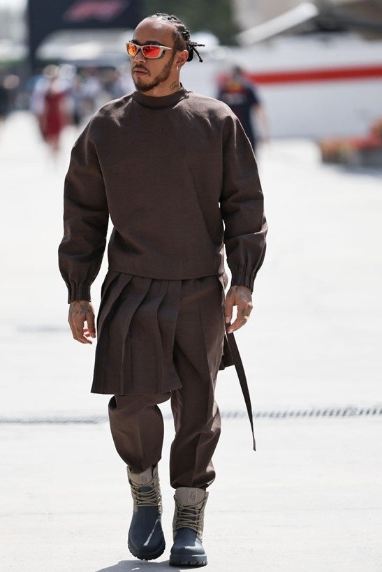 F1バーレーンGPに登場したルイス・ハミルトンは、ディオール 23年フォール メンズ コレクションから、ブラウンウールのテーラードトラックスーツトップ、同色のウールキルトとプリーツパンツ、「ディオール ガーデン」のブラウンレースアップブーツ、「ディオール エクスプローラー」サングラスを着用しました。