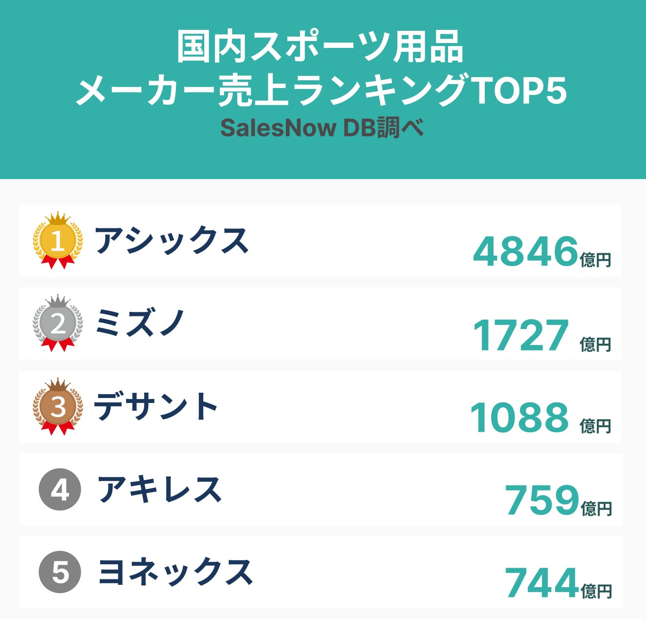 日本最大級のデータベースを誇る「SalesNow DB」において、国内スポーツ用品メーカー売上ランキングについて調査しました。