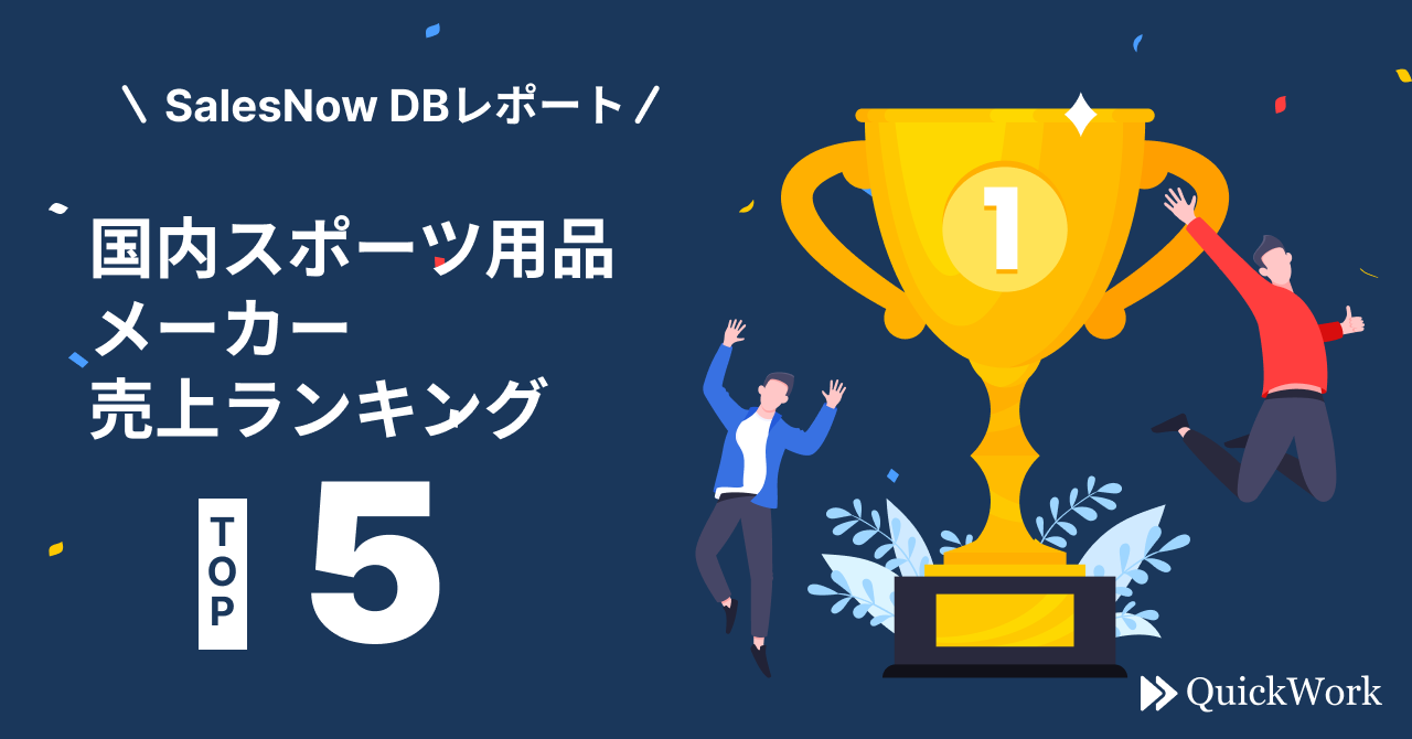 「データとテクノロジーで、働き方を変革する。」をミッションに掲げ、日本全国500万社以上の企業データを基盤に営業の効率化を支援する「SalesNow」を展開してきた株式会社QuickWork(本社:東京都渋谷区、代表取締役:村岡功規、以下「QuickWork」)は、日本全国500万社以上の企業情報を網羅した日本最大級のデータベースを誇る「SalesNow DB」において、国内スポーツ用品メーカー売上ランキングTOP5を抽出したのでお知らせします。