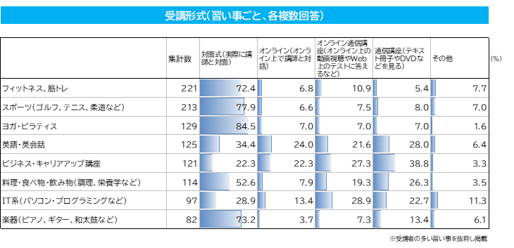 - 運動系や音楽系は対面、学習系はオンラインや通信講座で受講