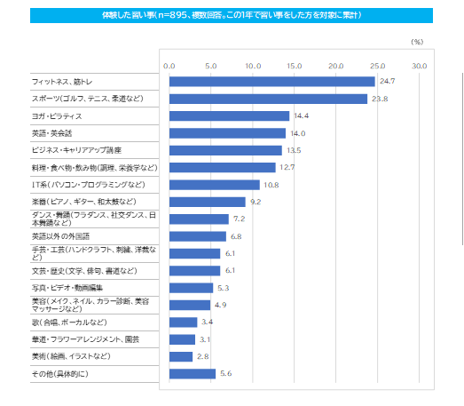 この1年で習い事を経験した方を対象に体験した習いごとの種類を見ていくと、「フィットネス、筋トレ」(24.7%)、「スポーツ(ゴルフ、テニス、柔道など)」(23.8%)が高く、「ヨガ・ピラティス」(14.4%)が続き、運動系が上位となりました。次に「英語・英会話」「ビジネス・キャリアアップ講座」といった学習系の習い事、「料理・食べ物・飲み物(調理、栄養学など)」となっています。