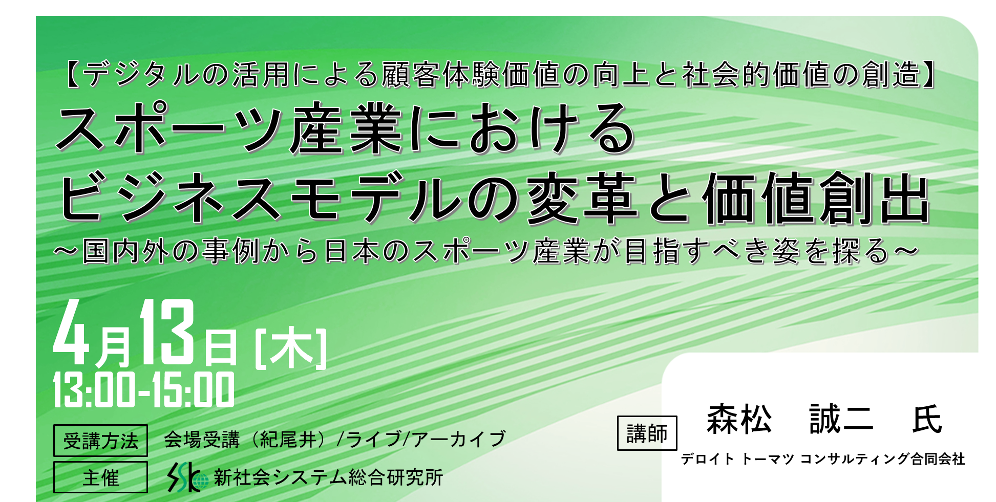 [講 師] デロイト トーマツ コンサルティング合同会社Sports Business Groupディレクター 森松 誠二 氏 [日 時] 2023年4月13日(木) 午後1時~3時 [受講方法] ■会場受講