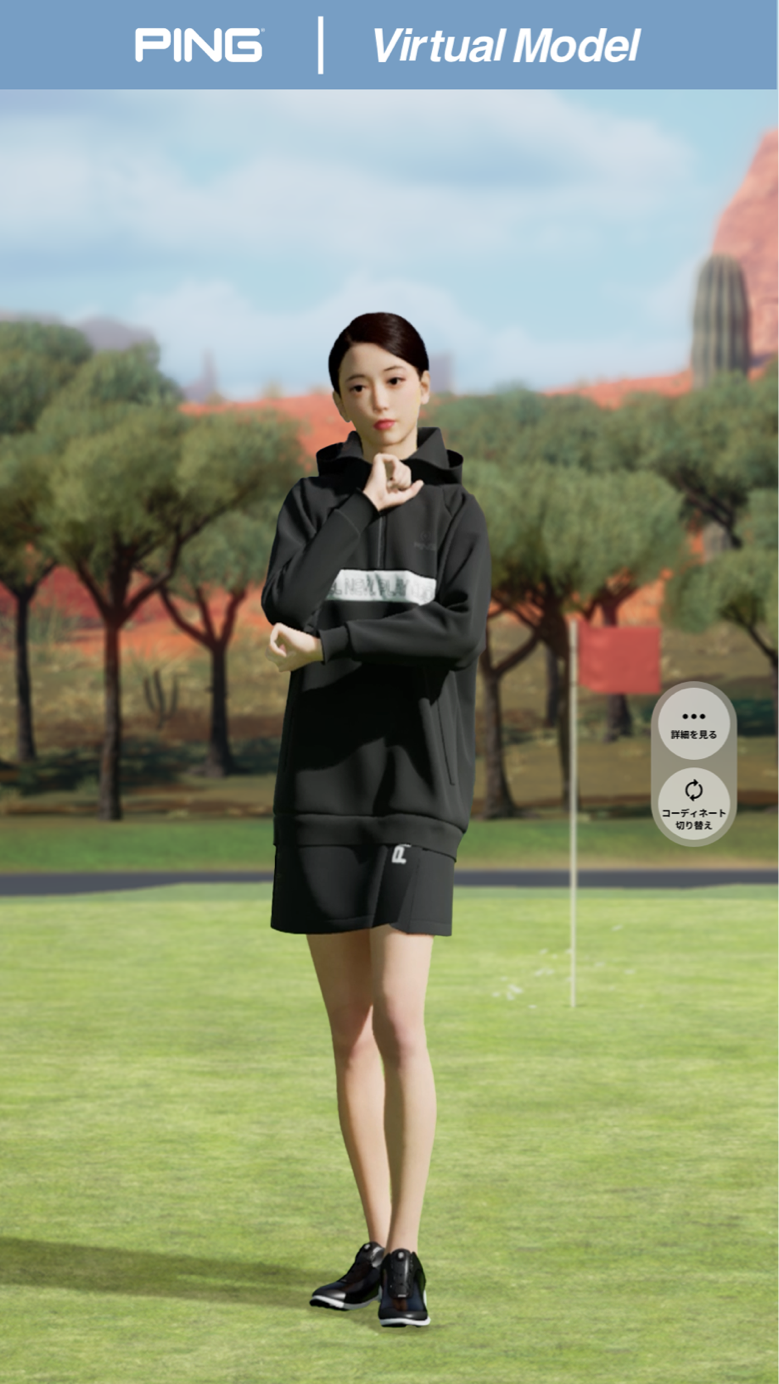 「te’resa(https://thinkr.jp/member/teresa/)」にもゴルフウェアを着せます。すでにVtuberとして活躍しているバーチャルタレントと商品のそれぞれの魅力を相乗させた効果的なPRを実施します。