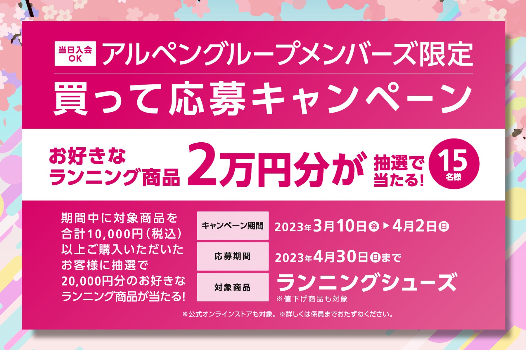 【応募資格】アルペングループメンバーズで、キャンペーン期間中に対象商品(ランニングシューズ)を合計10,000円(税込)以上ご購入いただいたお客様