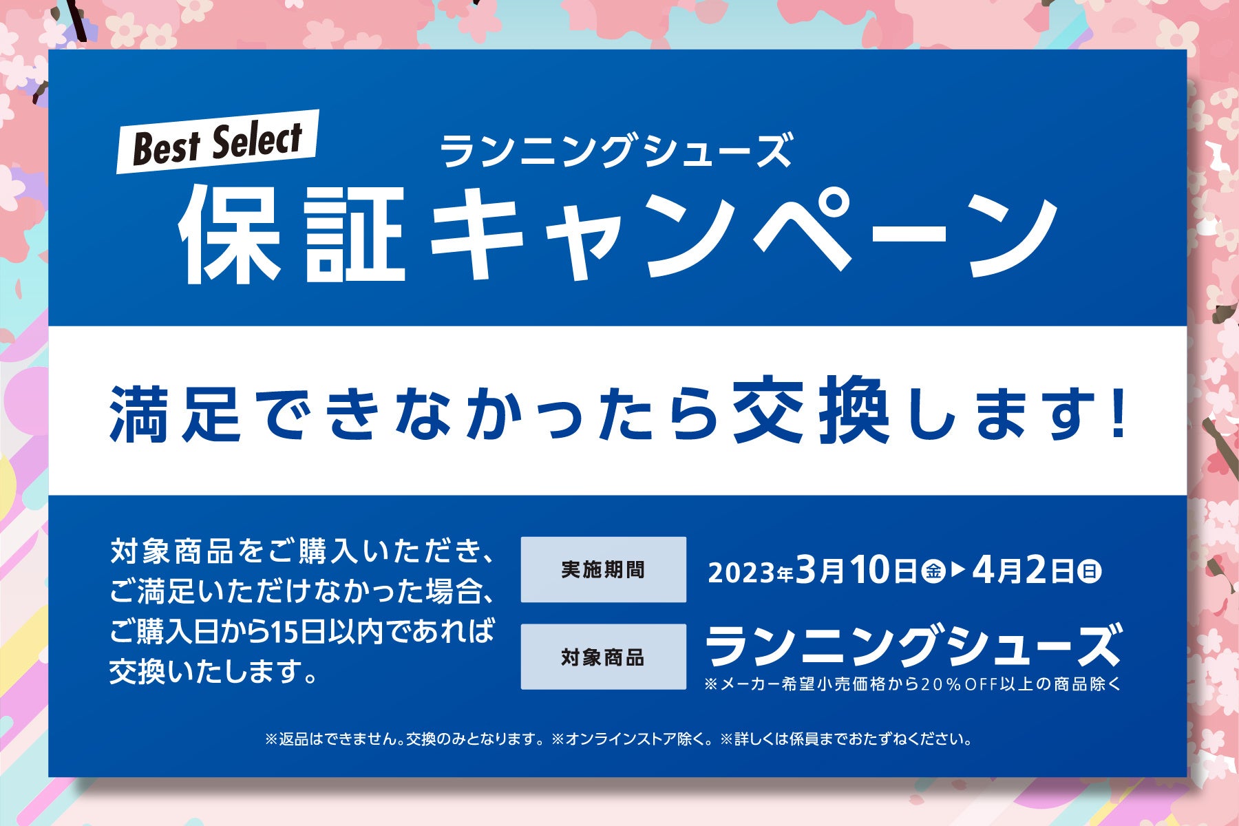 各社自信を持ってお勧めできるシューズだからこそ、もしご使用後に満足いただけない場合は商品交換が可能な「ランニングシューズ保証キャンペーン」を実施いたします。「春、楽しさ満開でいこう!」キャンペーン期間中にご購入のシューズを対象に、購入後15日以内であれば使用後でも他の商品と交換させていただきますので、安心してランニングシューズをご購入いただけます。(※オンラインストアを除く)
