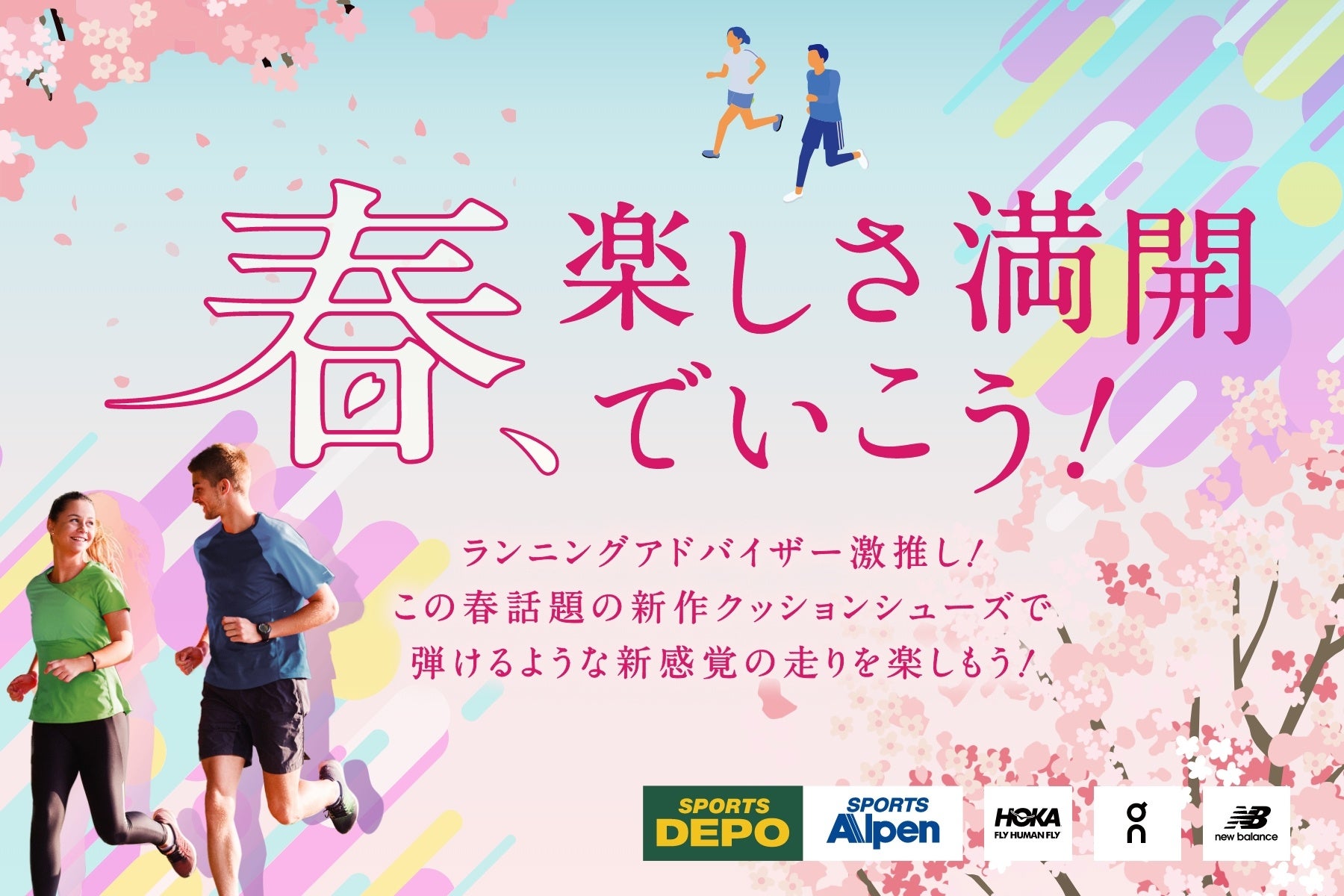 アルペンは、「スポーツをもっと身近に」をパーパスに掲げ、スポーツをもっと普及させていきたい、スポーツを楽しむ人たちに寄り添う存在でありたいという思いで活動してきました。そこで、この度スポーツデポ・アルペンは増加しているランナーの方々や、新学期や新生活を迎える方、この春新しく何かをはじめる方がランニングシューズを楽しく選ぶためのキャンペーン「春、楽しさ満開でいこう!」を2023年3月10日(金)〜4月2日(日)に開催いたします。