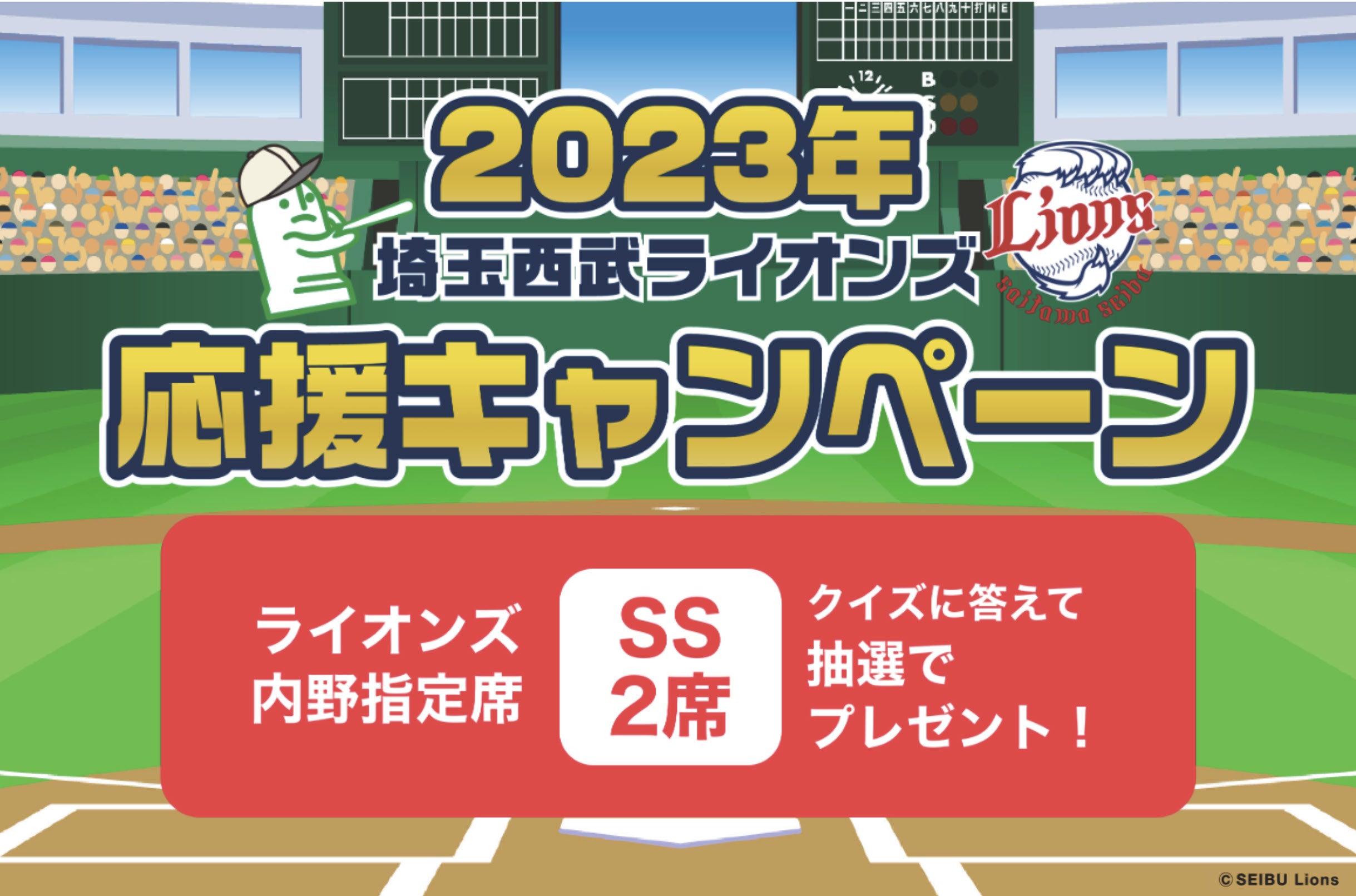2023年埼玉西武ライオンズ応援キャンペーンとして、ライオンズ内野席指定席SS席をプレゼント!松戸家のYouTube動画をご覧いただいた方には、抽選で豪華賞品を差し上げます!動画内で出題する問題にメールにて回答していただき、正解者の中から抽選で豪華賞品をプレゼント!ぜひ動画を見て、ご応募ください!