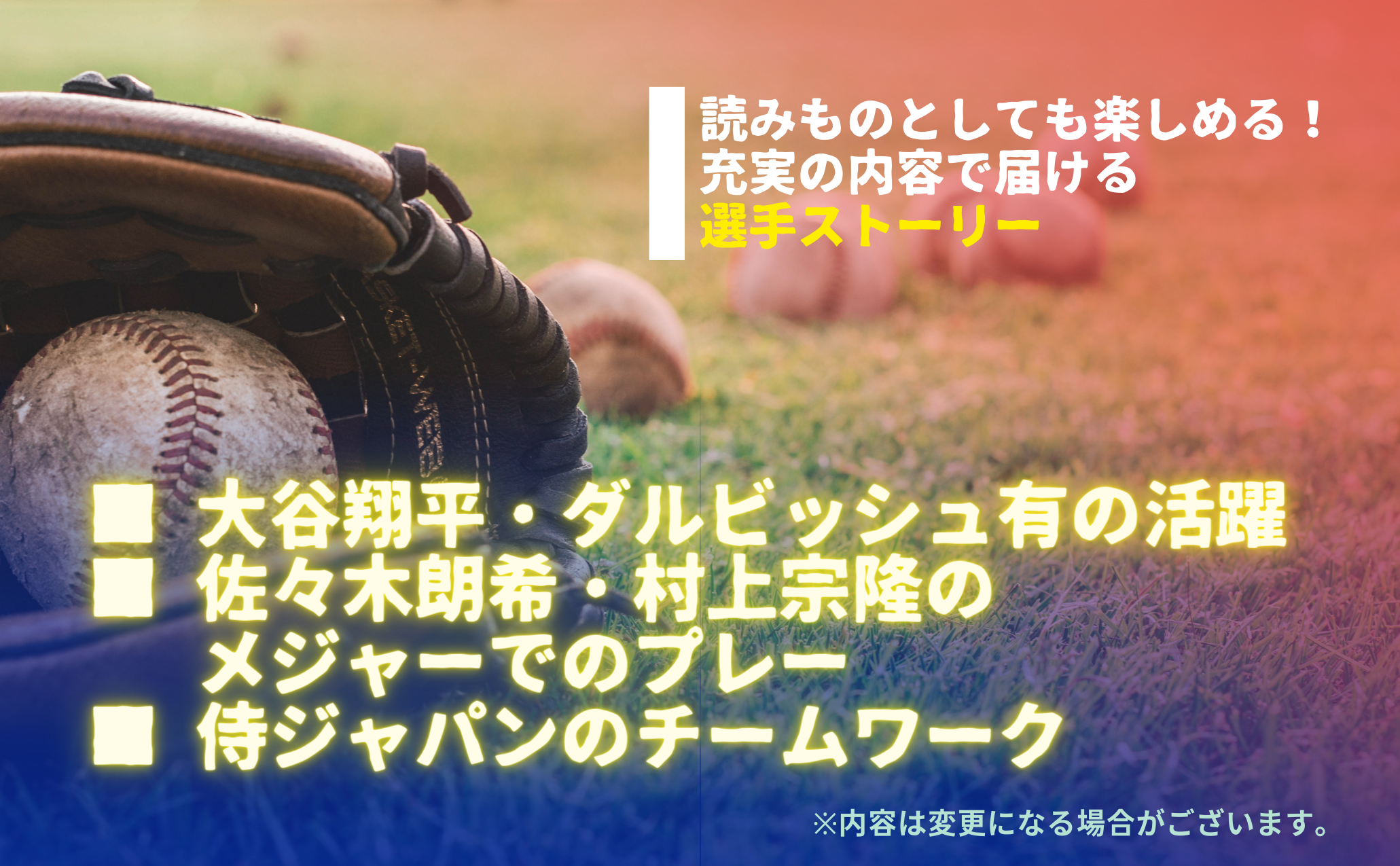大谷翔平・ダルビッシュ有の活躍ぶりや、佐々木朗希・村上宗隆のメジャーでのプレー、侍ジャパンのチームワークなどの激闘の舞台裏を、読みものとしても楽しめる「選手ストーリー」として、充実の内容でお届けします。
