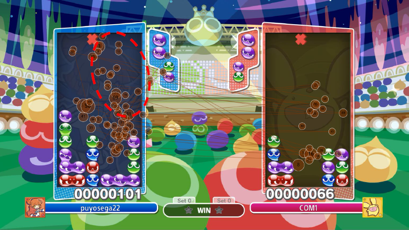 ぷよぷよのプロ同士の試合だと、自陣の連鎖を組むことに集中するのではなく、対戦相手の動向を見て組み方を変えたりする必要があります。