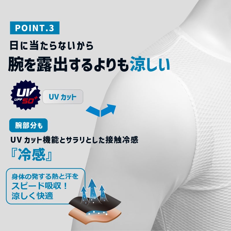 ・腕周りは日焼け防止のUVカットと通気性清涼感生地を採用。