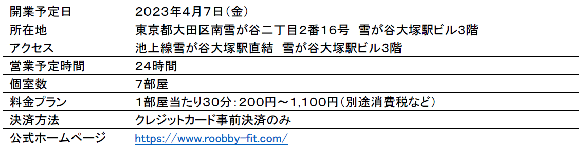 当社は、「社内起業家育成制度」第8号案件として、機能特化型個室シェアサービス「roobby」(読み方:ルービー) (以下、本サービス)を開始します。roobbyとは、部屋(room)+趣味(hobby)を組み合わせた造語であり、当社が用意した趣味の空間を、スマートフォンなどから気軽に予約し、誰にも邪魔されずに好きなだけ利用できるサービスです。今般、本サービスにおける第一業態として、フィットネスジムに特化した「roobby-fit 雪が谷大塚」(以下、本店舗)を4月7日(金)、池上線雪が谷大塚駅上にテストオープンします。