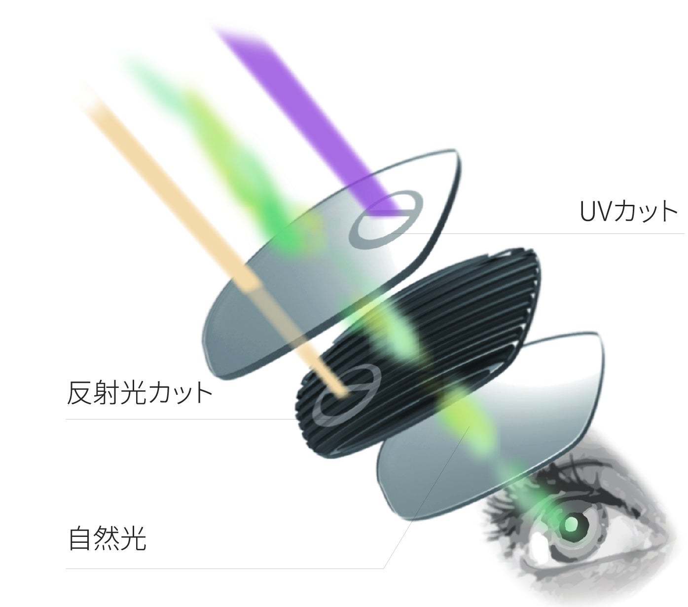 すべてのモデルに偏光レンズを採用。街中でも対向車線を走る車の運転者の表情がわかるほど高い視認性を誇り、車内からはダッシュボードの反射を抑えフロントガラス越しにも明瞭な視界を実現しています。また有害な紫外線は99.9%以上カットしています。