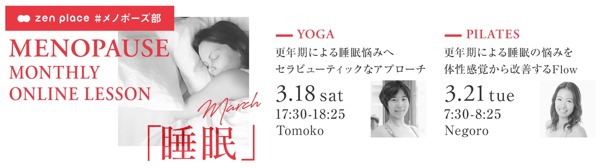 3月の「zen place #メノポーズ部」は、「睡眠」をテーマにピラティス、ヨガのオンライン・レッスンをそれぞれ開催します。