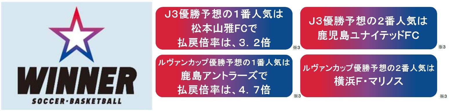 今シーズンのJ1、J2、J3の全試合※1、ルヴァンカップの全試合※1や天皇杯の試合※2の1試合予想くじを販売するほか、J3のリーグ戦やルヴァンカップの優勝チームを予想する競技会予想くじも販売中です。