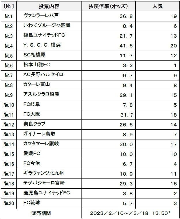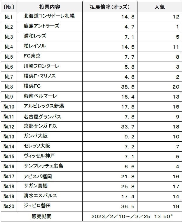 ※3 3月16日(木)10時時点の投票状況となります。払戻倍率(オッズ)は、投票状況により販売終了まで変動します。払戻倍率(オッズ)は、スポーツくじオフィシャルサイト(https://www.toto-dream.com/)で随時更新しています。