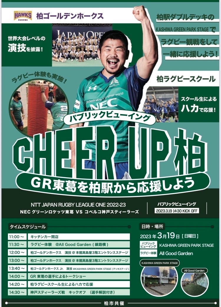 他にも柏ゴールデンホークスによるチアダンスのパフォーマンスや柏ラグビースクールがハカを披露したりと、楽しみがたくさん!