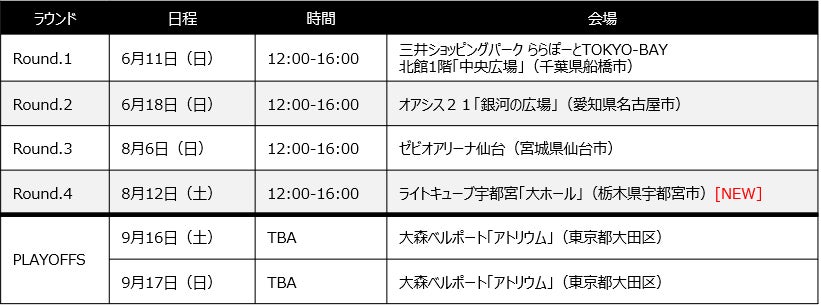 「イベントホール赤レンガ(北海道岩見沢市)」、「ライトキューブ宇都宮(栃木県宇都宮市)」、「TIPSTAR DOME CHIBA(千葉県千葉市)」、「ららぽーと名古屋みなとアクルス(愛知県名古屋市)」、「ひろしまゲートパークプラザ(広島県広島市)」、「宇部市俵田翁記念体育館(山口県宇部市)」「SAGAサンライズパーク パークテラス(佐賀県佐賀市)」の初開催7会場を含む、全国各地の地域の魅力や盛り上がりを感じることができる会場をはじめ、シーズンの締めくくりとなるPLAYOFFSは、9月16日(土)・17日(日) の2日間にわたり、「大森ベルポート(東京都大田区)」で開催いたします。