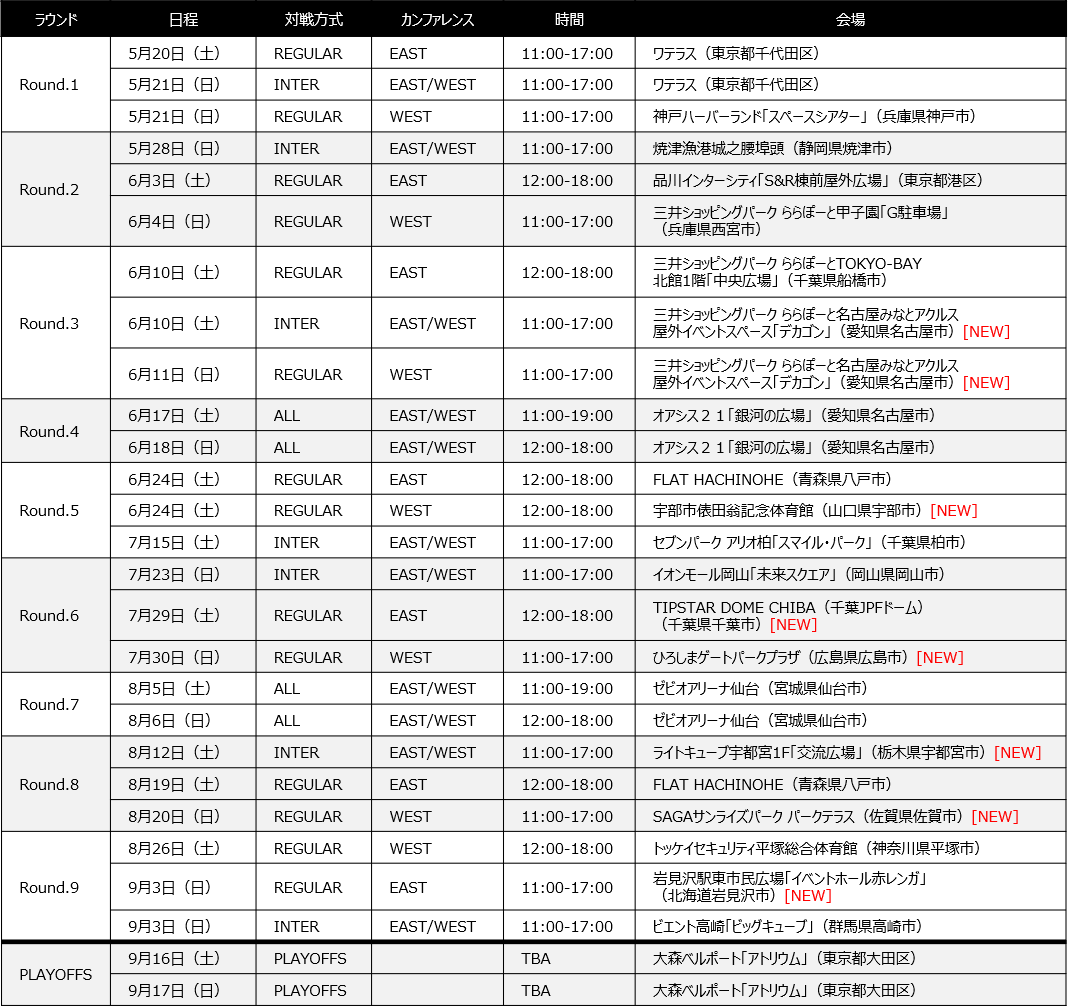 「イベントホール赤レンガ(北海道岩見沢市)」、「ライトキューブ宇都宮(栃木県宇都宮市)」、「TIPSTAR DOME CHIBA(千葉県千葉市)」、「ららぽーと名古屋みなとアクルス(愛知県名古屋市)」、「ひろしまゲートパークプラザ(広島県広島市)」、「宇部市俵田翁記念体育館(山口県宇部市)」「SAGAサンライズパーク パークテラス(佐賀県佐賀市)」の初開催7会場を含む、全国各地の地域の魅力や盛り上がりを感じることができる会場をはじめ、シーズンの締めくくりとなるPLAYOFFSは、9月16日(土)・17日(日) の2日間にわたり、「大森ベルポート(東京都大田区)」で開催いたします。