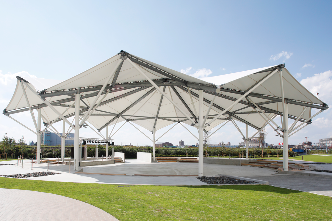 水と緑にあふれた港の新しい街を象徴する「みどりの大広場」内にある屋根付きイベントスペース「デカゴン」。