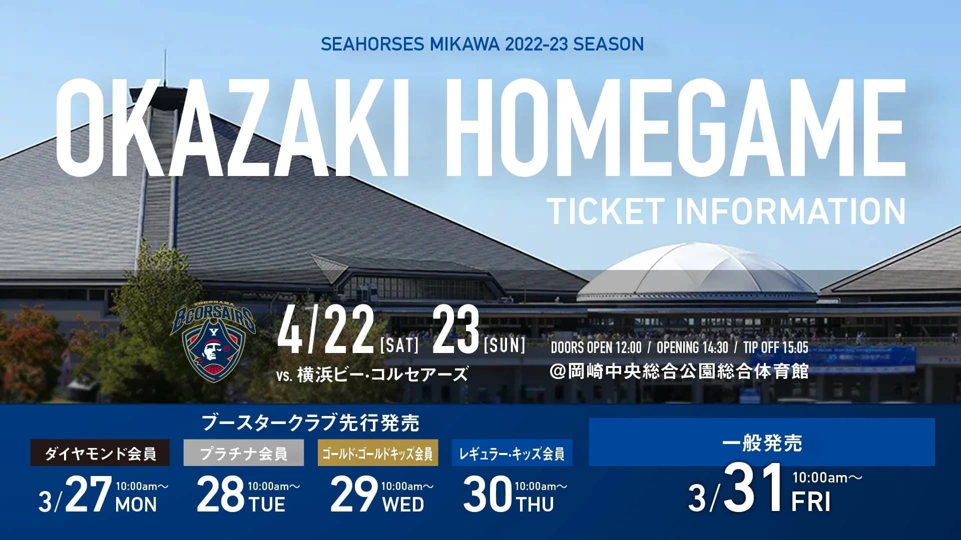 この度、4月22日(土),23日(日)横浜ビー・コルセアーズ戦(岡崎中央総合公園総合体育館)のチケット販売概要をお知らせします。