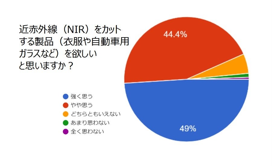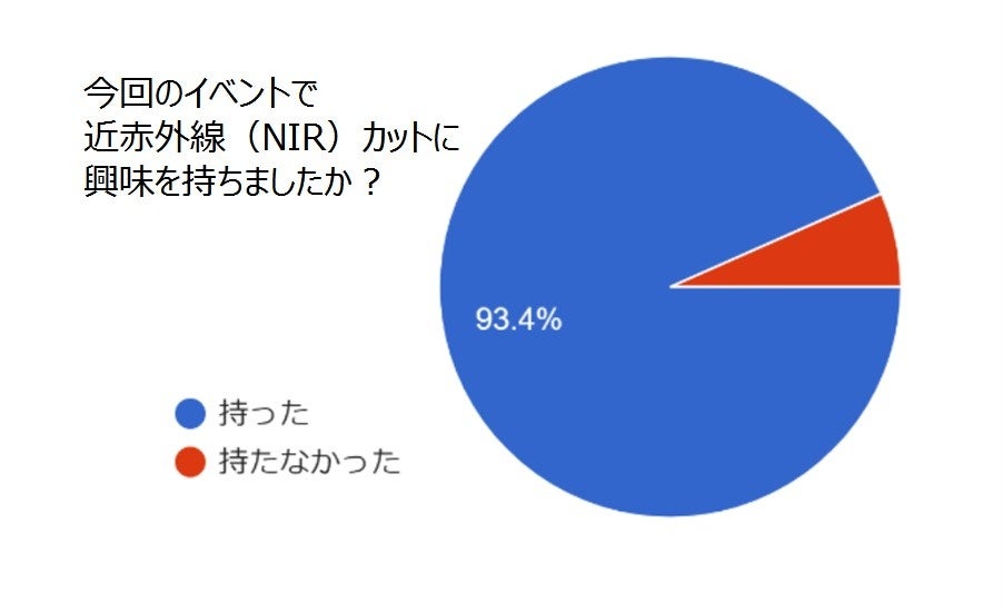 2022年8月に積水化学工業株式会社と当社が行ったアンケート調査では、「近赤外線」という言葉を約80%の人が「知らない」と回答しています。一方で、93%の人が近赤外線に興味を持ち、同じく93%の人が近赤外線をカットするする製品(衣服や自動車用ガラス等)が欲しいと回答しています。2022年には、東京で猛暑日が続き、1875年の統計開始以来、歴代最多日数を更新するなど気候や対処方法にも関する関心が高まっています。2023年も、業界の異なる両社がイベント会場や店舗等で、NIR(近赤外線)に対する認知拡大を行っていく予定です。