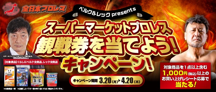 それに伴い、試合の観戦チケットが150組300名様に当たる「スーパーマーケットプロレス観戦券を当てよう!キャンペーン」を3月20日(月)よりスタートします。
