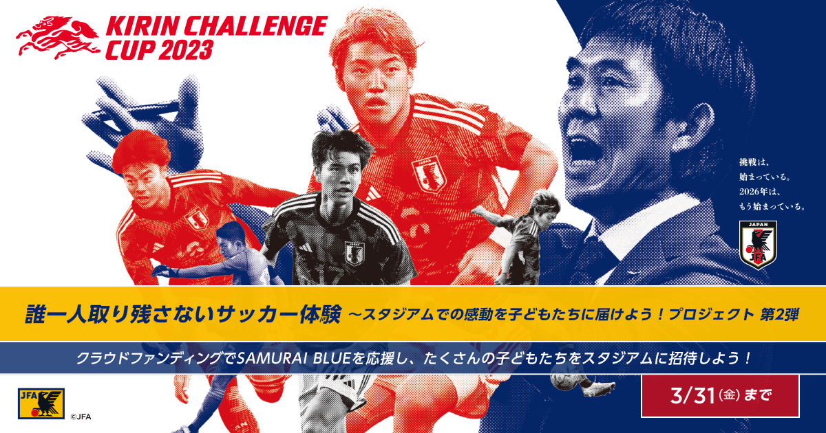 概要:集まった応援資金からシステム利用料などの経費を差し引いた金額を活用し、様々な理由によりサッカー日本代表戦のスタジアム観戦が困難な子どもたちを6月に開催するキリンチャレンジカップ2023に招待します。