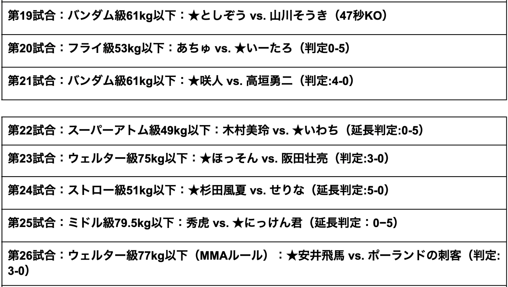 ゲンキ選手もすぐに立ち上がりますが、あつき選手の多彩な蹴りの前になす術もなく渾身の後ろ回し蹴りが決まりダウン。あつき選手が白星を飾りました。