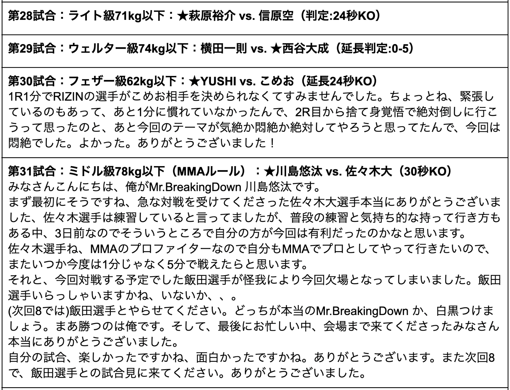 飯田選手の代わりに川島悠汰選手の対戦相手は朝倉未来チャンネルから佐々木大選手が、またSATORU選手とてる選手の代替カードにはハイメ選手対小柴亮太選手の試合が急遽決定しました。