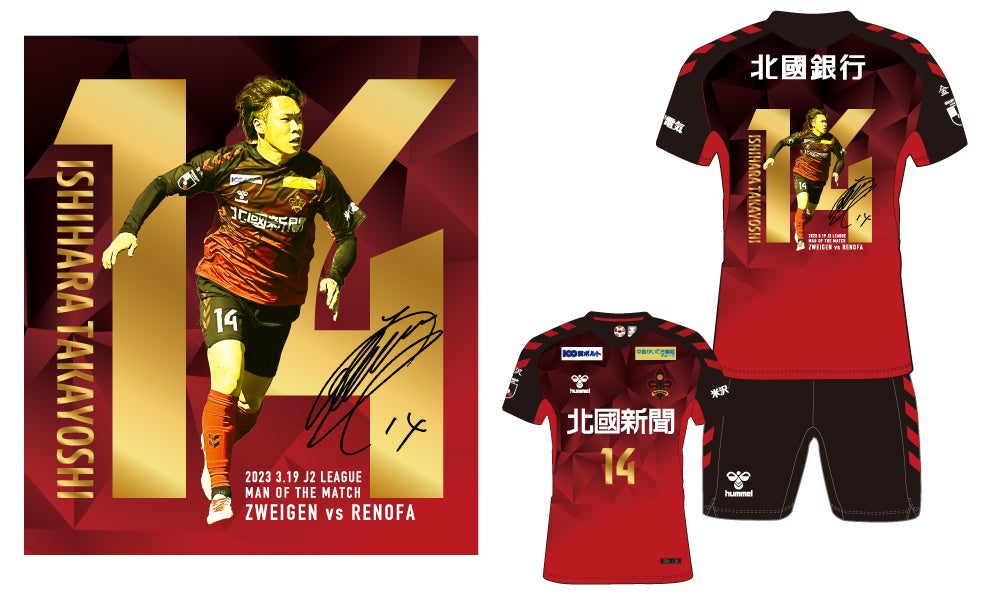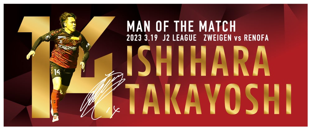2023シーズン明治安田生命J2リーグ第5節レノファ山口FC戦において、5-2でホーム初勝利!大量得点の試合でしたが、最も試合に貢献した選手として、第1回勝ちユニのデザインになる選手は、ミッドフィルダーの背番号14番石原崇兆選手に決定!