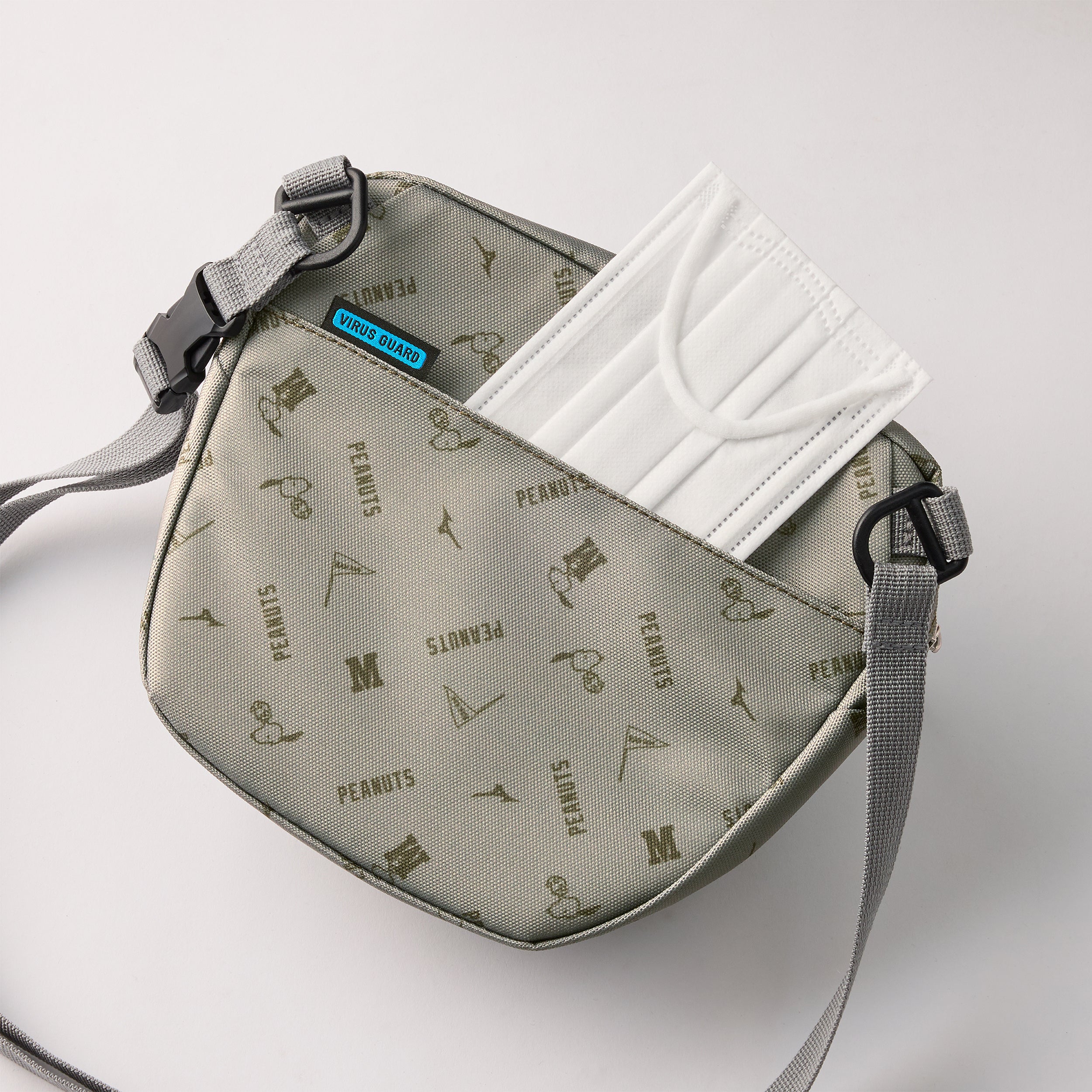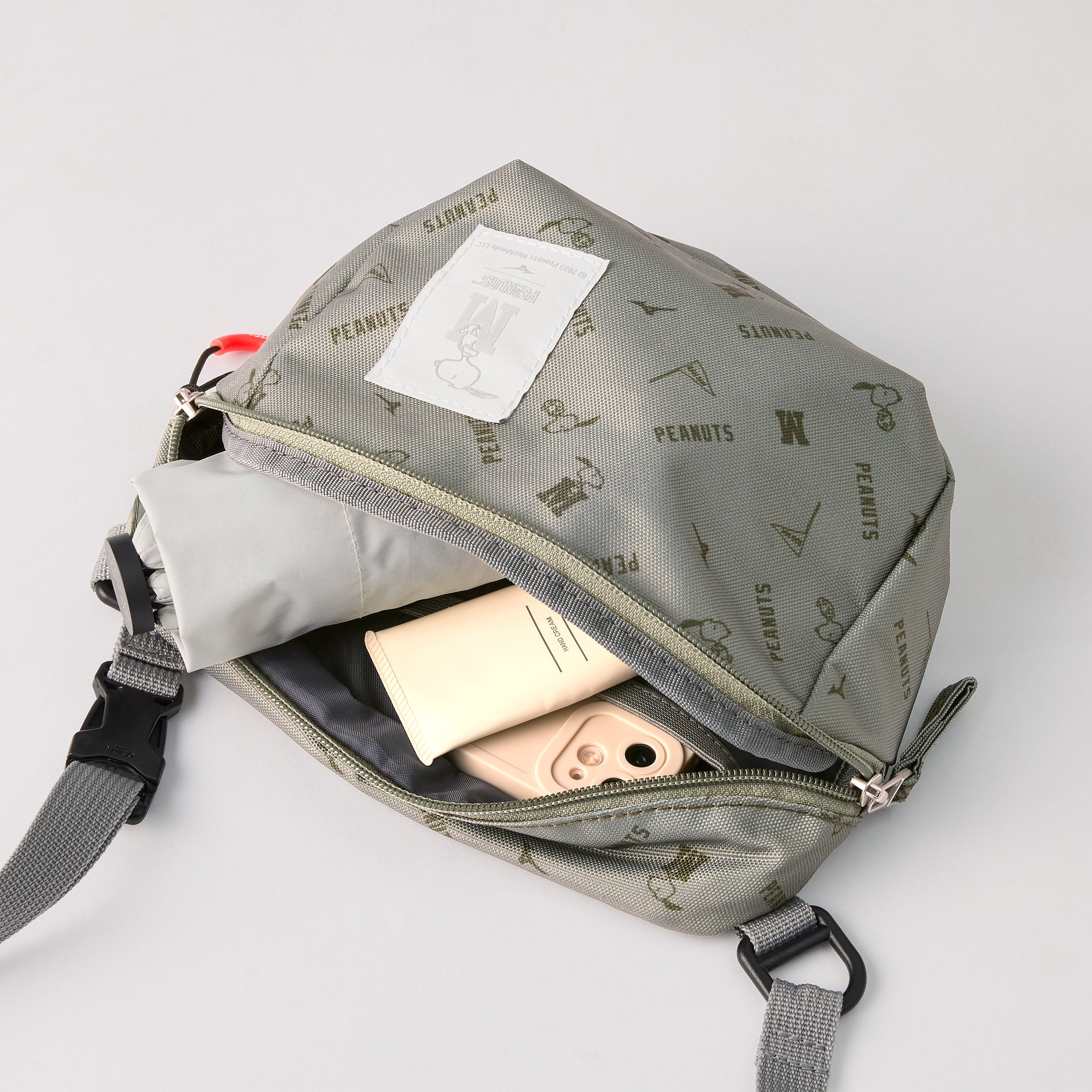 ちょっとしたお出かけから旅先でも使いやすいショルダーポーチです。全面にスヌーピーが散りばめられたオリジナル柄で、本体ファスナーにはスヌーピーの首輪をモチーフにした引手を使用し、MizunoのMとスヌーピーをデザインしたオリジナルロゴネーム入りです。